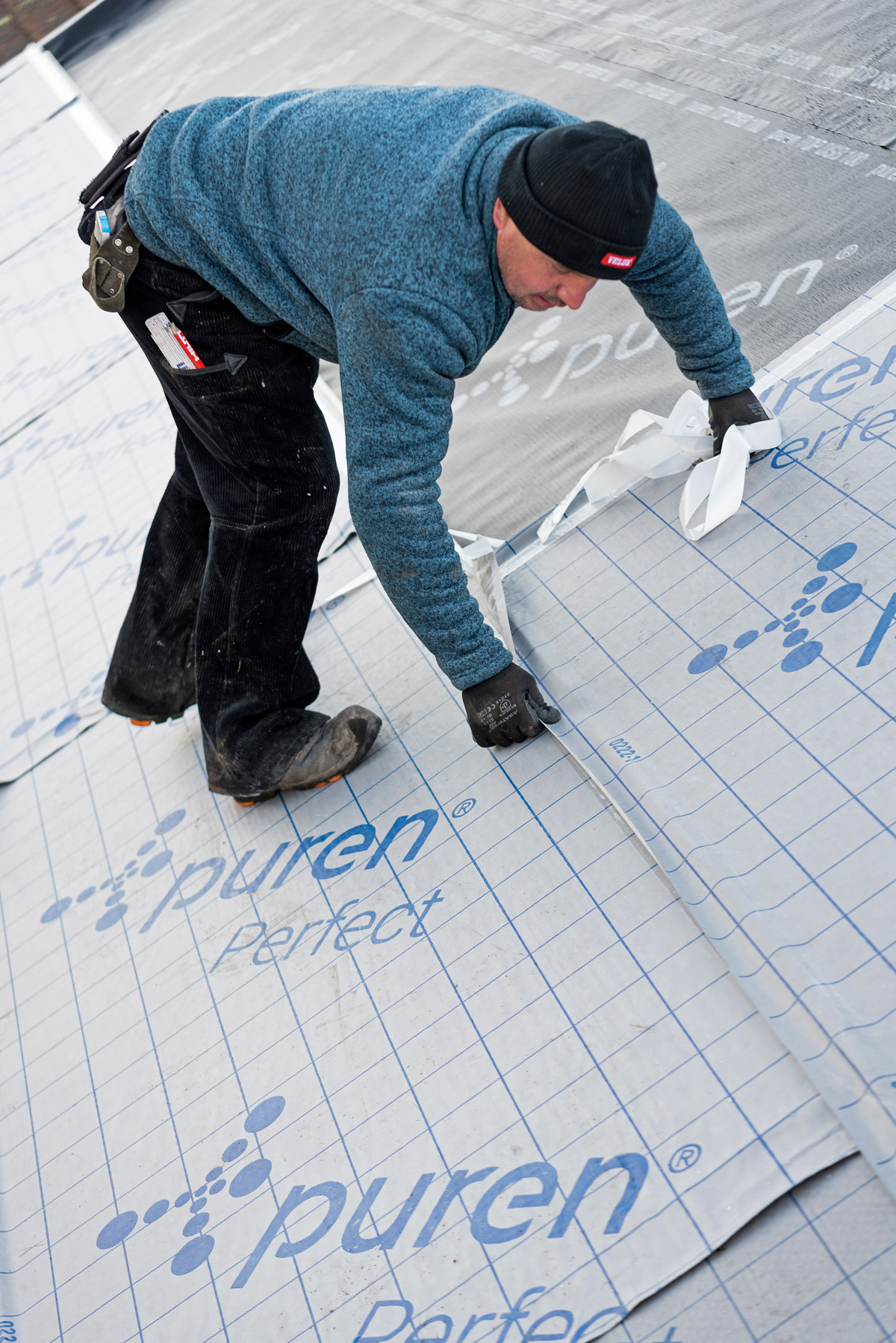 Im Traufbereich sorgen auf die Tragkonstruktion montierte Anschlaghölzer für einen sicheren Arbeitsbeginn mit gerader Kante. Die Verlegung der 160 mm dicken PU-Hartschaumplatten »puren Perfect« mit umlaufender Nut und Feder erfolgte im Regelfall noch am gleichen Tag. Gemäß DIN 4108-4 weisen die hochwirksamen Dämmelemente einen Bemessungswert der Wärmeleitfähigkeit λ (Lambda B) = 0,023 W/(m2K) auf. Oberseitig sind auf den PU-Hartschaumplatten diffusionsoffene Unterdeckbahnen aufkaschiert, die ebenfalls werkseitig mit einem »Kleber-auf-Kleber«-System ausgerüstet sind. Das ermöglicht eine dauerhaft winddichte und kapillarfreie Verklebung im überlappenden Nahtbereich. Die abschnittsweise verlegten PU-Dämmplatten wurden von den Fachhandwerkern, wo notwendig, passend zugeschnitten. Die Bearbeitung der leichten Platten ist einfach und schnell auszuführen. Entstandene Hohlräume wurden ausgeschäumt oder mit Mineralwolle ausgefüllt.