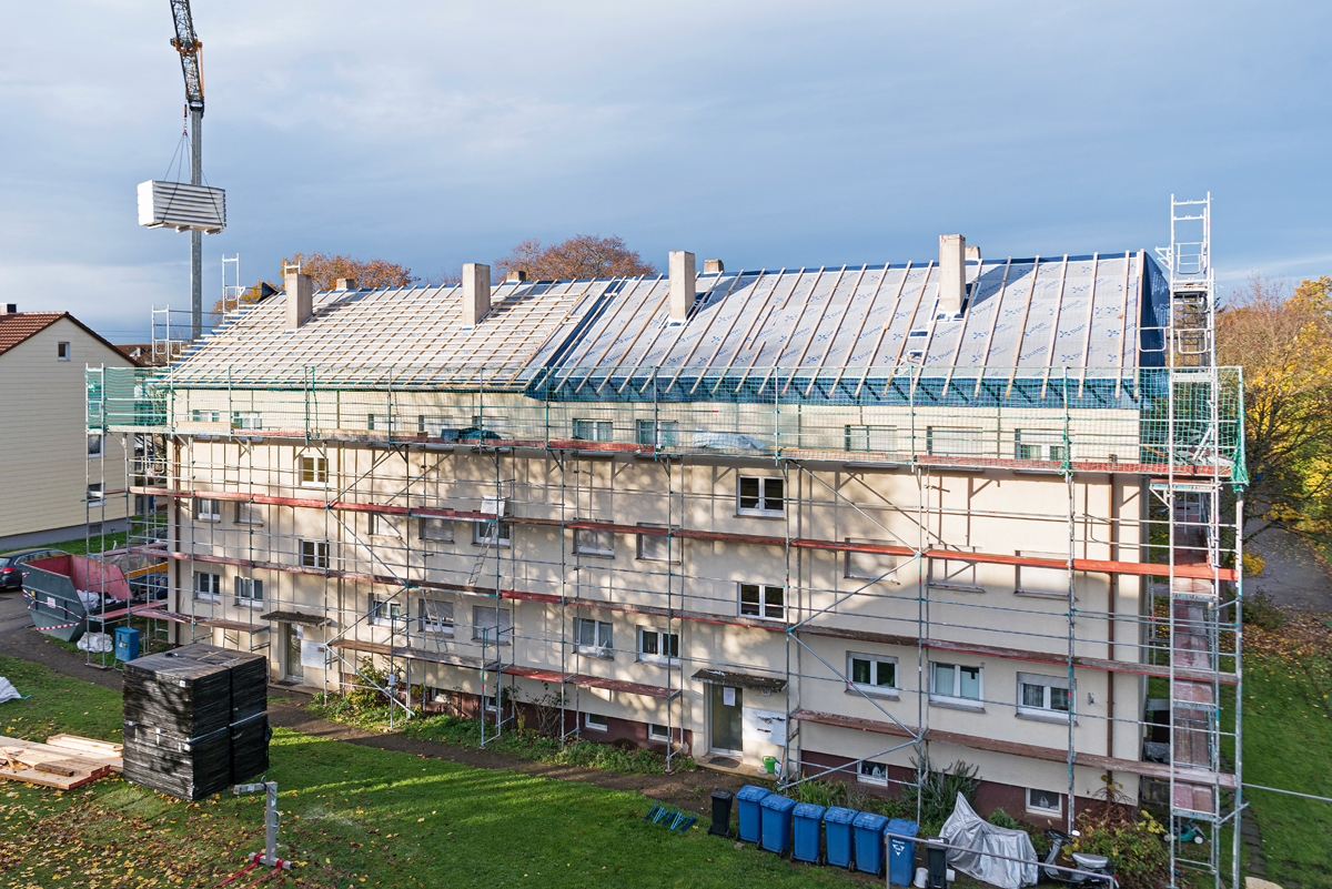 Für ein Gebäude benötigten die Fachhandwerker knapp dreieinhalb Wochen, um das 380 m2 große Satteldach komplett zu sanieren. Zudem passte auch das Wetter, sodass die vier Handwerker zügig durcharbeiten konnten. So waren am Ende des Jahres noch vor Weihnachten nicht nur die Dächer perfekt gedämmt und sicher gedeckt, sondern auch die Mehrfamilienhäuser wieder komplett ausgerüstet und energetisch optimiert. Mit der hochwirksamen Aufsparrendämmung von Puren konnten deshalb Wärmeverluste über das Bauteildach erheblich reduziert werden. Und dank des vorausschauend geplanten und ausgeführten Traufdetails ist bei einer späteren Dämmung der Fassade der wärmebrückenfreie Anschluss an die Dachdämmung ebenfalls möglich.