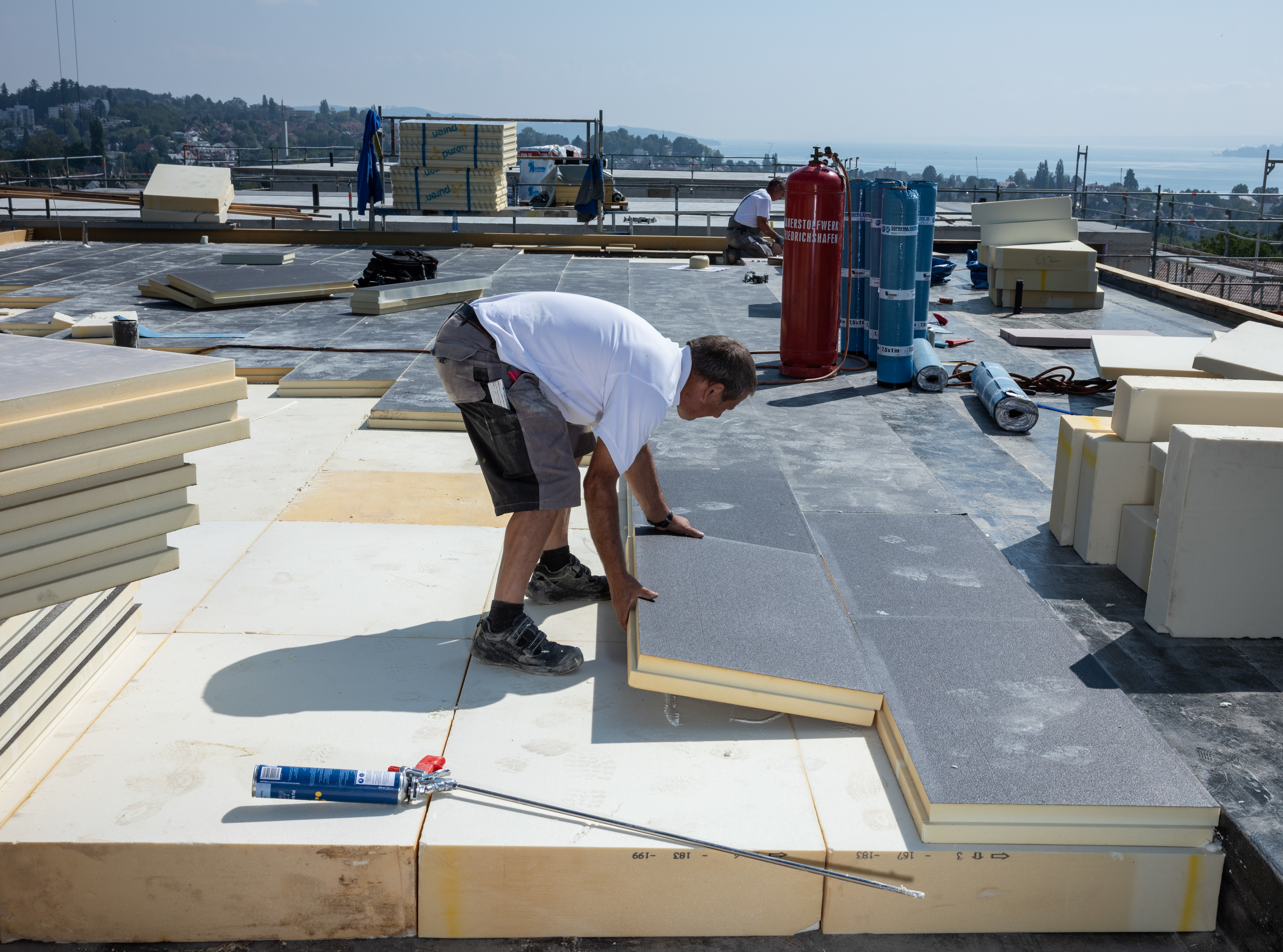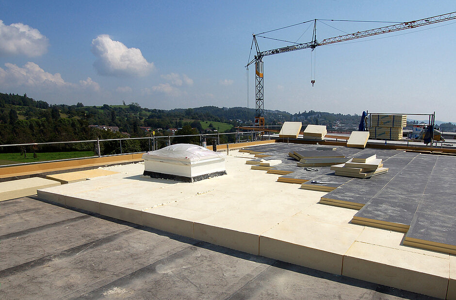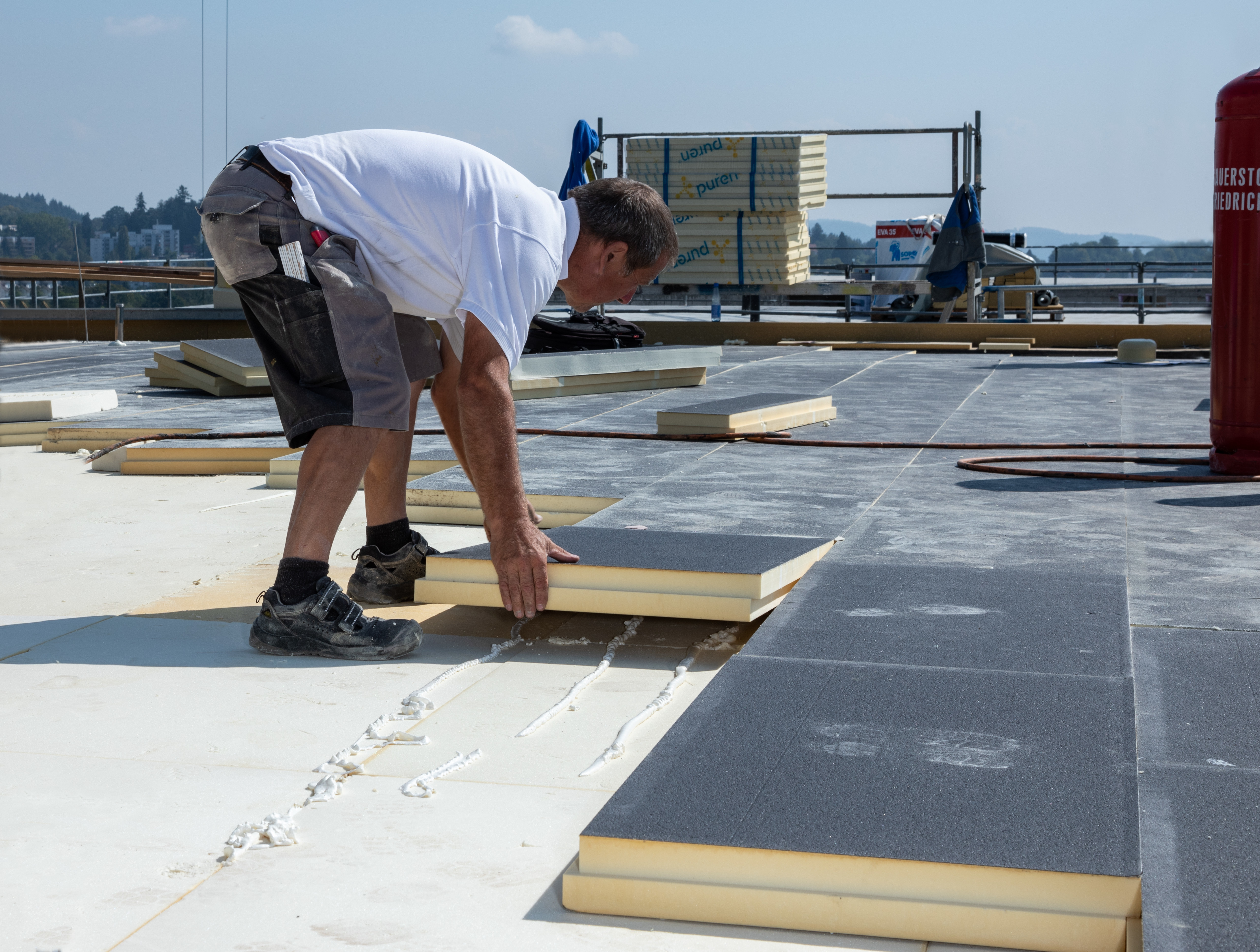 Die Secure-Platten sind in den Formaten 600 x 1200 mm und 600 x 2400 mm in Dicken von 80 bis 200 mm verfügbar. Als 600 x 600 mm große Quadrate ist puren Secure kompakt sogar für Kompaktdächer verwendbar. Für Gefälledächer werden 80 mm dicke, stumpfkantige Secure-Platten auf PU-Gefälledämmungen (z. B. puren NE 120) verlegt. Für Grate und Kehlen gibt es unter 45° geschnittene Secure-Formteile. Damit sind objektspezifisch geplante Gefälledächer gezielt umsetzbar.