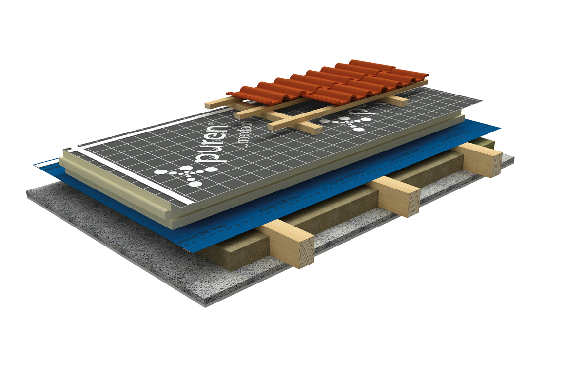 Eine hochwirksame Dämmung bei geringer Materialdicke, das sind laut Hersteller die untrüglichen Kennzeichen der PU-Dämmsysteme von puren. Mit dem »puren Unterdach Dämmsystem« lassen sich diese produktspezifischen Eigenschaften auch auf Steildächern mit höchsten Zusatzanforderungen nutzen. Dank umlaufender Nut und Feder-Verbindung gelingt die wärmebrückenfreie Vollflächendämmung oberhalb der Sparren problemlos. Die abhängig von Kaschierung und Materialdicke in den Wärmeleitstufen WLS 023, 026 und 027 verfügbaren PU-Hartschaumplatten sind oberseitig mit einer monolithischen und diffusionsoffenen High-Tech-Unterdachbahn kaschiert.
