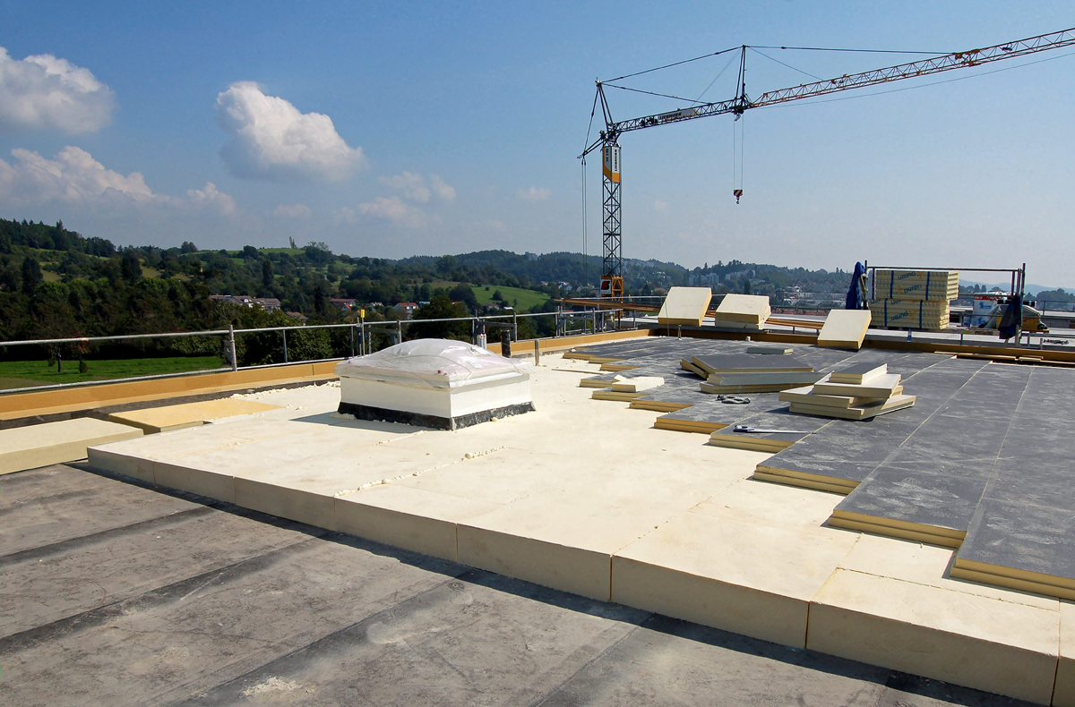 Die »Secure«-Platten sind in den Formaten 600 x 1200 mm und 600 x 2400 mm in Dicken von 80 bis 200 mm verfügbar. Als 600 x 600 mm große Quadrate ist »Puren Secure kompakt« sogar für Kompaktdächer verwendbar. Für Gefälledächer werden 80 mm dicke, stumpfkantige »Secure«-Platten auf PU-Gefälledämmungen (z. B puren NE 120) verlegt. Für Grate und Kehlen gibt es unter 45° geschnittene Secure-Formteile. Damit sind objektspezifisch geplante Gefälledächer gezielt umsetzbar. J