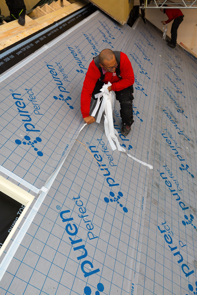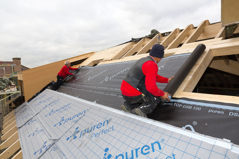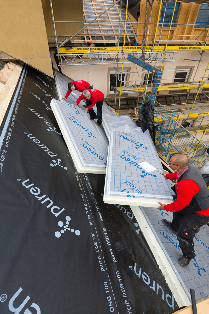 Nach Abschluss der Schalarbeiten wurde in Speyer vollflächig die Luftdichtung »puren Top DSB 100« verlegt. Mithilfe der integrierten doppelten Klebestreifen und der hochfesten sogenannten »Kleber-auf-Kleber«-Verbindung fügten sich die einzelnen Bahnen zu einer durchgängigen luftdichten Membrane. Anschlüsse an umgebende Bauteile wurden je nach Situation und Untergrund mit der Kartuschen-Klebedichtung »puren AnschlussFix« oder mit dem Dichtklebeband »puren ProfiTape« luftdicht ausgeführt. Abschließend folgten von Traufe zum First die neuen puren-Dämmelemente. Die auf der PU-Dämmung aufkaschierte Unterdeckbahn (sd-Wert 0,1 m) sei besonders robust und rutschfest, sodass die Handwerker sicher über die Dachflächen gehen könnten. Die zweiseitig überlappenden Unterdeckbahnen mit integrierten doppelten Klebestreifen verbinden nach Abziehen der Schutzfolien auch die oberseitigen Unterdeckbahnen zu einer großen wind-, regen- und hagelfesten Unterdeckung. Mit dem 300 mm breiten, selbstklebenden First-, Kehl- und Gratband »puren Diffucell« wurden zum Schluss auch am First die schräg zugeschnittenen Dachelemente fachgerecht verklebt. J