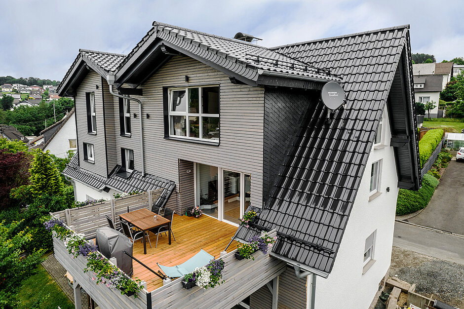 Viel neue Wohnfläche realisierte ein Bauherr bei einer Komplettsanierung eines im Familienbesitz befindlichen Hauses in Hanglage. Der Dachgeschossausbau ist nicht eingeschossig, wie üblich, sondern zweigeschossig konzipiert. Gedämmt sind die neuen Dachflächen mit leistungsfähigen Steildach-Dämmelementen »puren Plus«. 190 m2 hochwertige Wohnfläche sind im Ober- und Dachgeschoss entstanden. Im Erdgeschoss darunter befindet sich eine vermietete, 90 m2 große Wohnung. Über einen Zugang durchs Kellergeschoss kann der Bauherr seinen Garten nutzen.