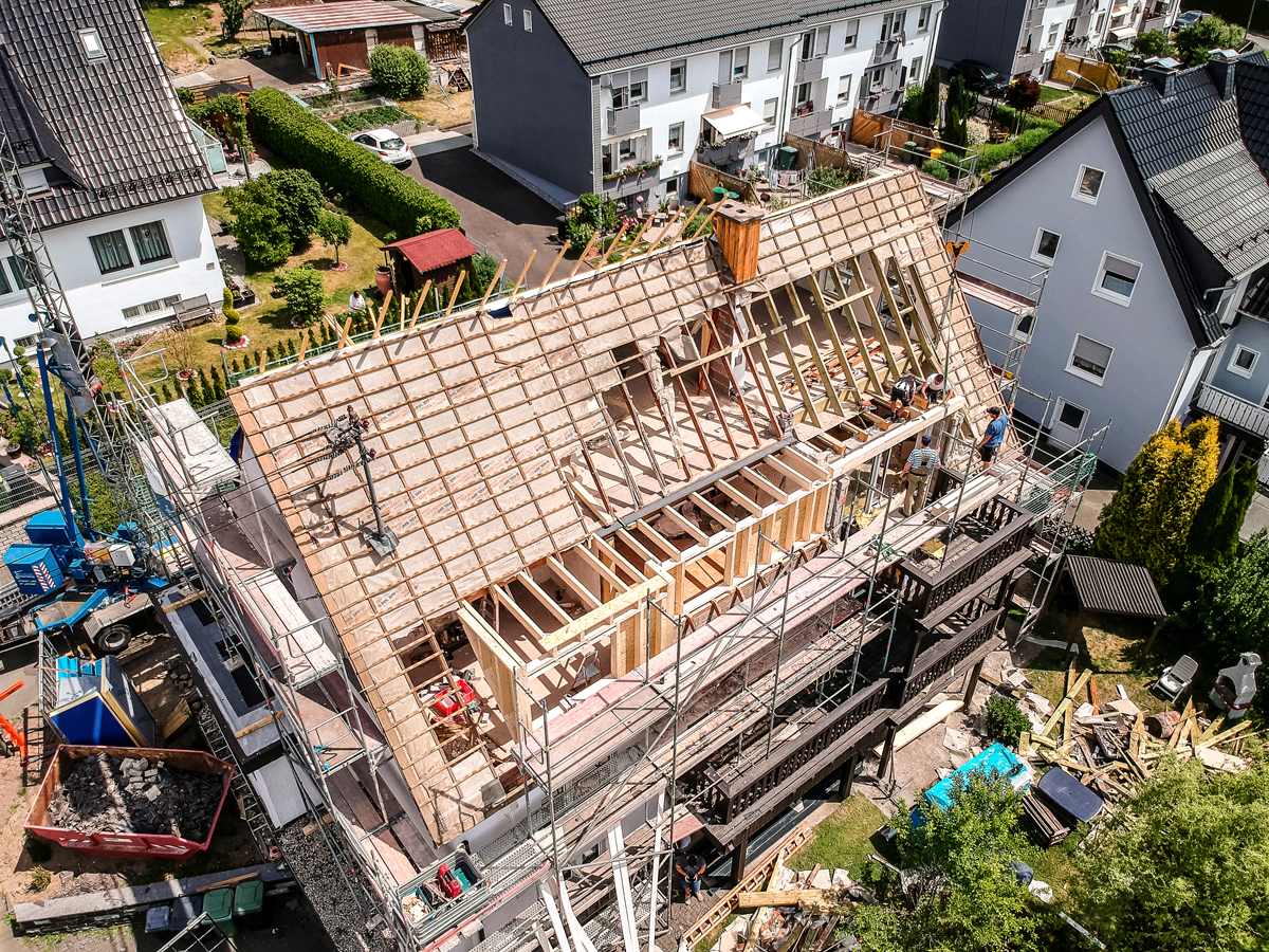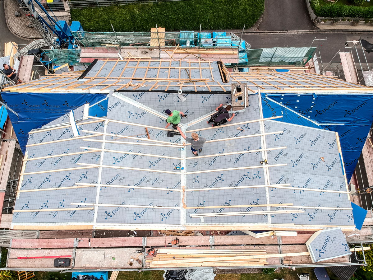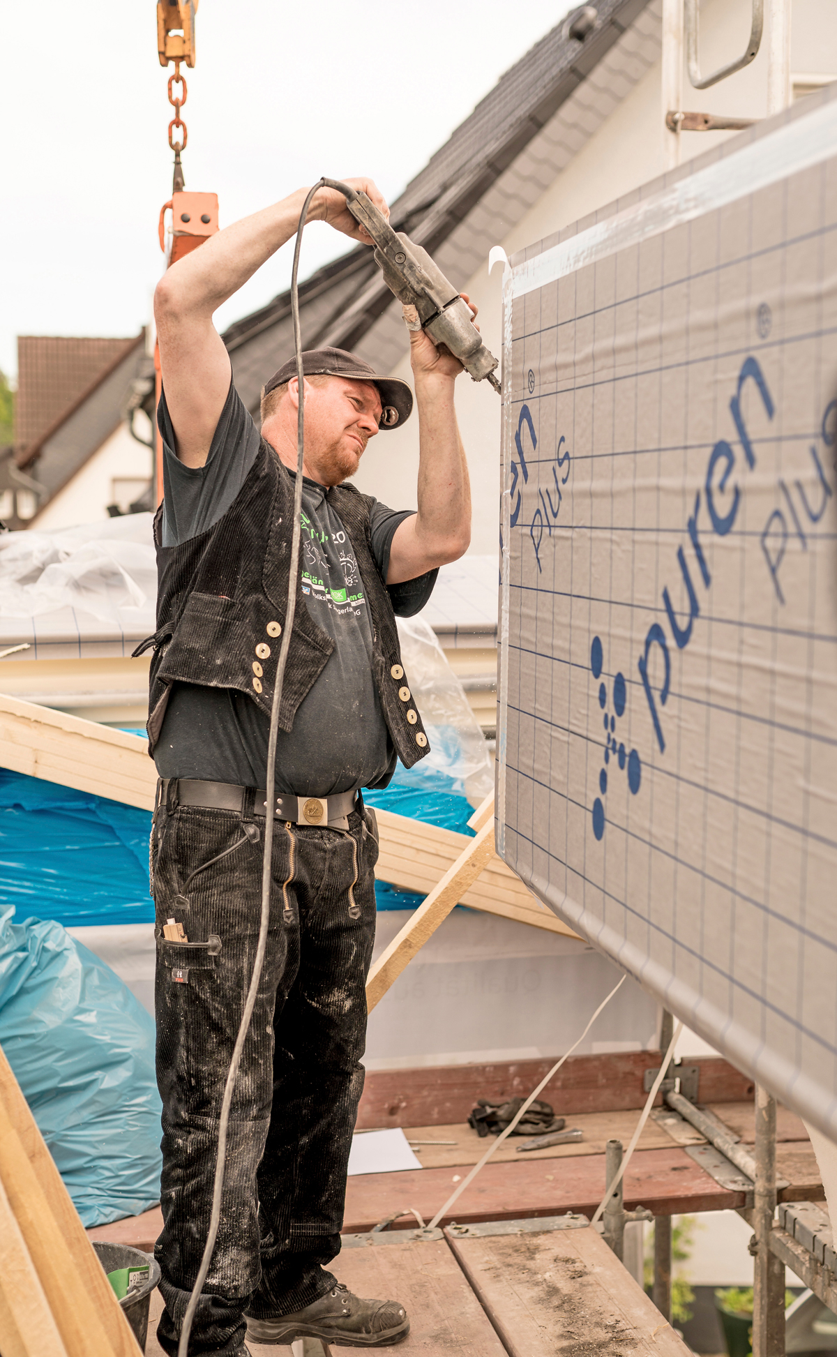 1959 wurde das Einfamilienhaus komplett mit Holzbalkendecken errichtet. Ein erster Ausbau aus dem Jahr 1990 hat bereits eine Stahlbetondecke. Bei der jetzt realisierten Komplettsanierung wurden die Hohlräume der obersten Holzbalkendecken mit schallschützenden Holzfasern ausgeblasen und über die Stahlbeton- und Holzdecken eine bis zu 15 cm dicke Estrichschicht als Ausgleichs-, Stabilisierungs- und Schallschutzschicht gelegt. Auf diese ertüchtigte und verstärkte Decke bauen die zwei neuen Dachgeschosse auf. Der Bauherr, von Beruf Dachdecker, hat bereits umfangreiche Erfahrungen mit Dachgeschossausbauten. So wurden neben dem klassischen Holzbau und hochwertigen puren-Dämmungen auch Holzelemente eingesetzt, die die neuen Dachgeschosse prägen und aussteifen.