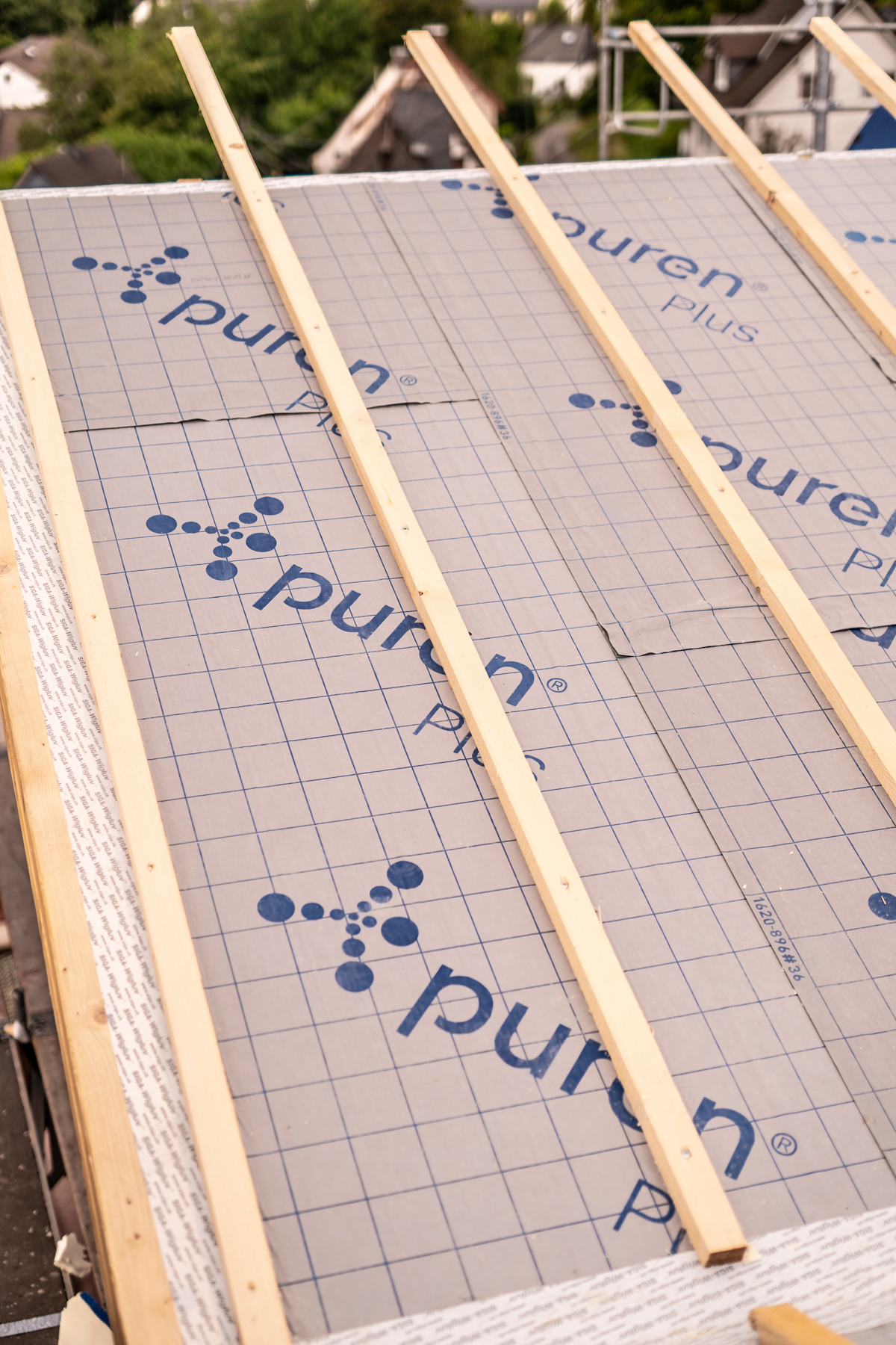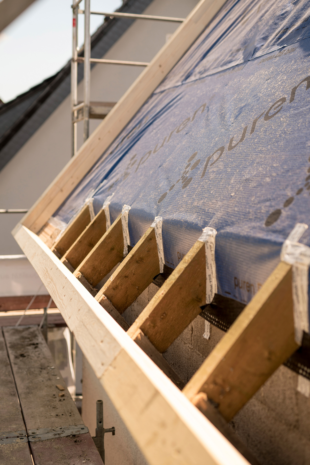 Reine Holzbauten sind keineswegs einfach zu konstruieren, sollen Schall- und Wärmeschutz vorbildlich gelöst werden. Bei diesem Ausbau kombinierte der Bauherr hoch leistungsfähige PU-Aufsparrendämmungen von puren mit Holzfaser. Die Dachschrägen wurden mit dem Steildach-Dämmelement »puren Plus« mit 160 mm Dicke beplankt (Wärmeleitfähigkeit des PU: 0,026 W/(mK), daraus U-Wert: 0,16 W/(m²K)). Zwischen den 180 mm hohen Sparren wurde Holzfaser eingeblasen (Wärmeleitfähigkeit Holzfaser: 0,04 W/(mK), daraus U-Wert: 0,22 W/(m²K)). Zwischen den zwei Dämmlagen sorgt die spezielle Dampfbremse »puren DB blau« für Luftdichtheit. Beide Dämmlagen zusammen erreichen laut puren einen hervorragenden U-Wert von 0,11 W/(m²K) und zugleich einen sehr guten Schallschutz. Von innen sind die Dachschrägen mit einer speziellen »gerichteten feuchtevariablen Dampfbremse« ausgestattet (sd-Wert zwischen 0,8 und 35 m). Sie sorgt für eine sichere Trocknung der Dachkonstruktion. Lattungen und Gipskartonplatten vollenden die Dachkonstruktion raumseitig.