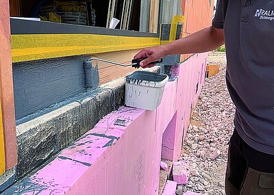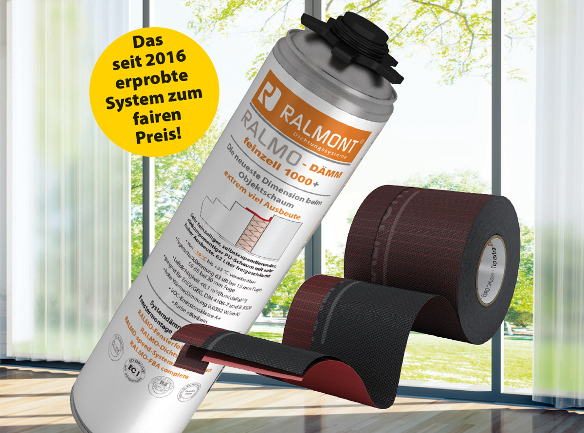 Für die Luftdichtigkeit und perfekte Wärme- und Schalldämmung kommt der extrem feinporige und sehr dichte PU-Montageschaum »Ralmo-Dämm feinzell+« zum Einsatz. Hier die technischen Daten: Luftdichtigkeit a < 0,1m³/ [h.m.(daPa) 2/3] und Wärmeleitfähigkeit ca. 0,0362 W / (m · K) Der Montageschaum ist zertifiziert nach EC1 plus (sehr emissionsarm). In Ebene 2 folgt die äußere Abdichtung: Diese erfolgt mit der selbstklebenden, überputzbaren und schlagregendichten Fensteranschlussfolie »Ralmo-Euro«. Besondere Vorteile: Das Wasser perlt auf dieser Folie sehr gut ab, ist nicht saugend und die Folie ist ein Jahr frei bewitterbar. Ein weiteres Plus: Zusätzlich können noch fertige Komponenten, wie z. B. der »Ralmo-FBA«-Dämm-/Dichtkeil oder »Ralmo«-Montageecken tiefgezogen verarbeitet werden.
