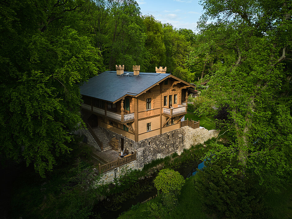 »Charakteristisch für die Schweizer Häuser sind die weit auskragenden Dächer, die aufwendigen Holzschnitzereien an Balkonen und Austritten sowie die reich verzierten Fassaden auf einem massivem Felssteinsockel«, beschreibt Magnus Creutzfeldt die charakteristischen Merkmale des Schweizer Haus-Stils, der im 19. Jahrhundert das damalige Ideal von Naturverbundenheit verkörperte.