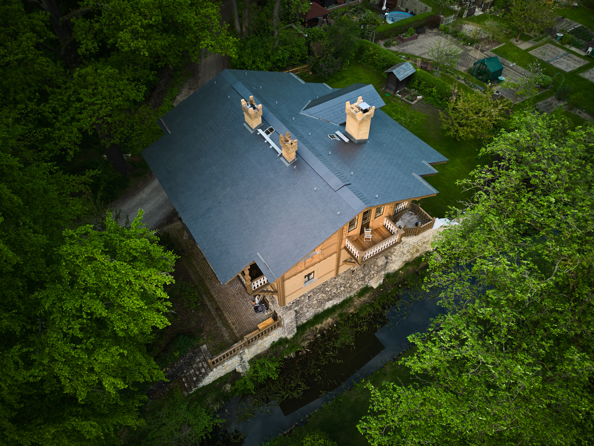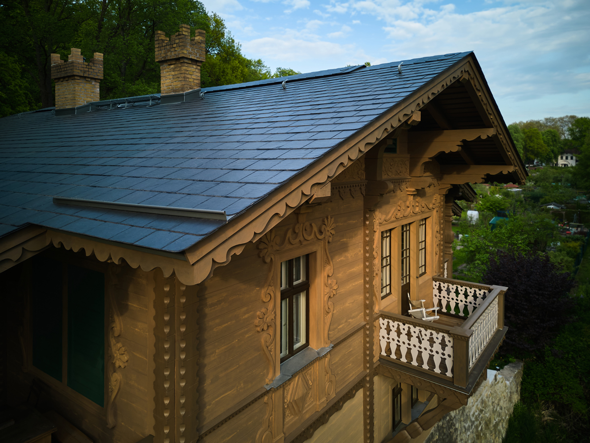 Ein zentrales Element der Restaurierung war die Sanierung des 270 m2 großen, um 22 Grad geneigten Satteldachs mit seinen großen Dachüberständen. Zuletzt war die Fläche zu DDR-Zeiten mangels Kapitals und vorhandener Alternativen mehrfach mit Bitumen abgedichtet worden, zur Instandhaltung von Traufleisten und Ortgängen war notdürftig günstiges »Duroplast« zum Einsatz gekommen. Im Rahmen der Sanierung wurden diese provisorischen Baustoffe wieder abgetragen und das Dach mit rechteckigen Schiefersteinen der Marke InterSIN von Rathscheck Schiefer neu eingedeckt. Das Unternehmen mit Sitz in Mayen in der Eifel zählt zu den führenden Schieferproduzenten weltweit und besitzt eigene hochwertige Vorkommen in Spanien: »Mit der Wahl dieses Millionen Jahre alten Materials sind wir der Originaleindeckung am nächsten gekommen«, wie Magnus Creutzfeldt erklärt. »Hinzu kommt, dass Schiefer ein nachhaltiges Naturmaterial ist, das durch seine Langlebigkeit bei einer Denkmal-Sanierung unschlagbar ist.«