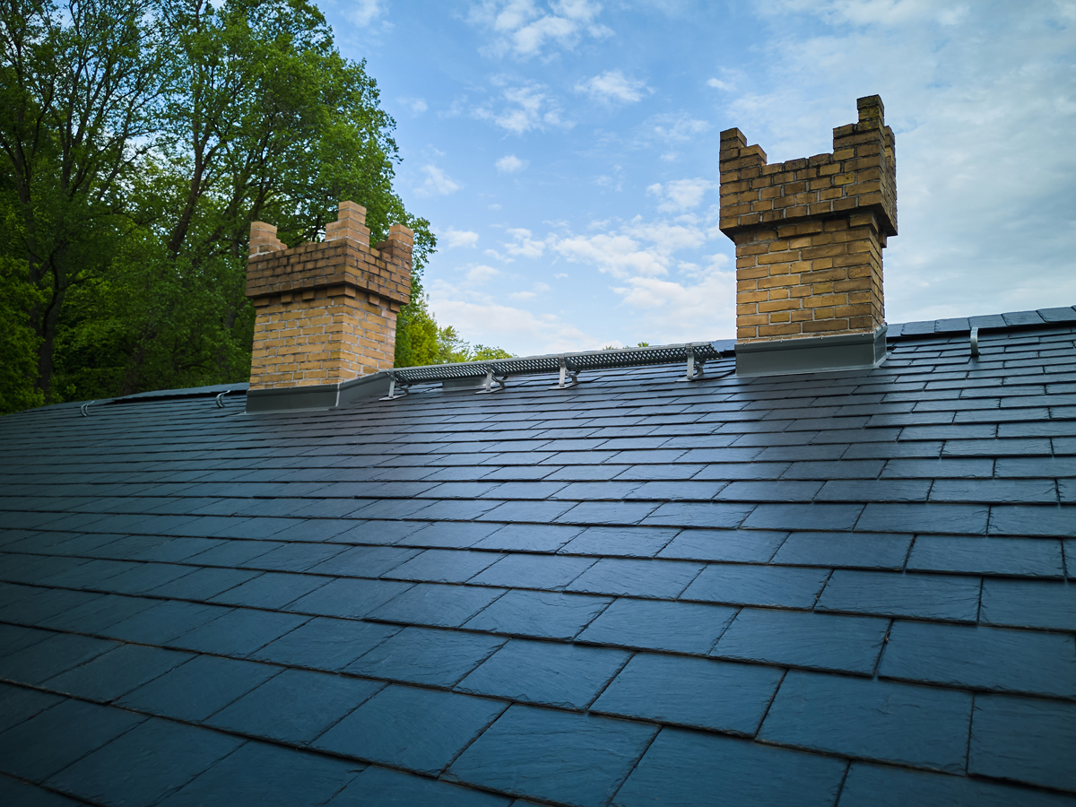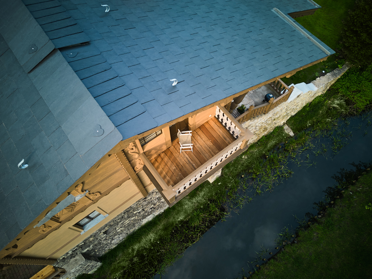 Im nächsten Schritt konnte mit der Schiefereindeckung begonnen werden. Passend zum Stil des Hauses und angelehnt an die Optik typischer Steinlege-Dächer aus dem Berner Oberland wurde eine sogenannte Rechteck-Doppeldeckung ausgeführt: »Ausgehend von der erforderlichen Höhenüberdeckung von 12 cm haben wir 60 x 30 cm große, hochkant verlegte Schiefersteine verwendet, um im Ergebnis eine sichtbare Höhe von 24 cm zu erhalten«, erläutert Dachdeckermeister Nils Blank. »Die Steine der dritten Reihe überdecken die Steine der ersten Reihe somit um 12 cm.« Das Ergebnis überzeugt auf den ersten Blick: Die lediglich 5 mm dünnen, im halben Verband angeordneten und jeweils mit mindestens zwei Schiefernägeln befestigten Steine von Rathscheck Schiefer verbinden das historisches Vorbild mit geringem Flächengewicht und zeitlos-ästhetischer Anmutung.