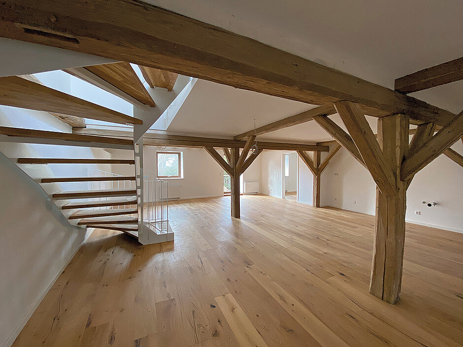 Durch die natürliche Abnutzung und den Verschleiß wiesen die verschiedenen Konstruktionen wie Fachwerkhäuser mit Holztragwerk, Scheunen, Kreuzgratgewölbe und raumspannende Sandsteinbögen erhebliche Mängel auf. Antje Riedl setzte auf das vielseitige Produktportfolio von redstone, das einen maßgeschneiderten Raumkomfort für die verschiedenen neuen Raumfunktionen ermöglicht und den architektonischen Charme der einzelnen Baukörper erhält. Um gleichzeitig die energetischen Anforderungen für den Effizienzstandard Denkmal realisieren zu können, entschied man sich bei der Innendämmung für das »Pura System«. Als ökologische und emissionsarme Mineraldämmung aus Kalziumsilikat verspricht es ein angenehmes Raumklima und geringe Heizkosten. Aufsteigende Feuchtigkeit war in fast allen Räumen ein grundlegendes Problem. Bei der Sanierung wurden rund 7 000 Bohrlöcher erstellt, in die die »Secco Horizontalsperre« eingebracht wurde. Danach wurde auf die Außenwände ein Sperrputz mit einer salzsperrenden Grundierung aufgebracht. Die Außenabdichtung erfolgte mit der mineralischen und kälteflexiblen Abdichtungsmasse »Secco One«.