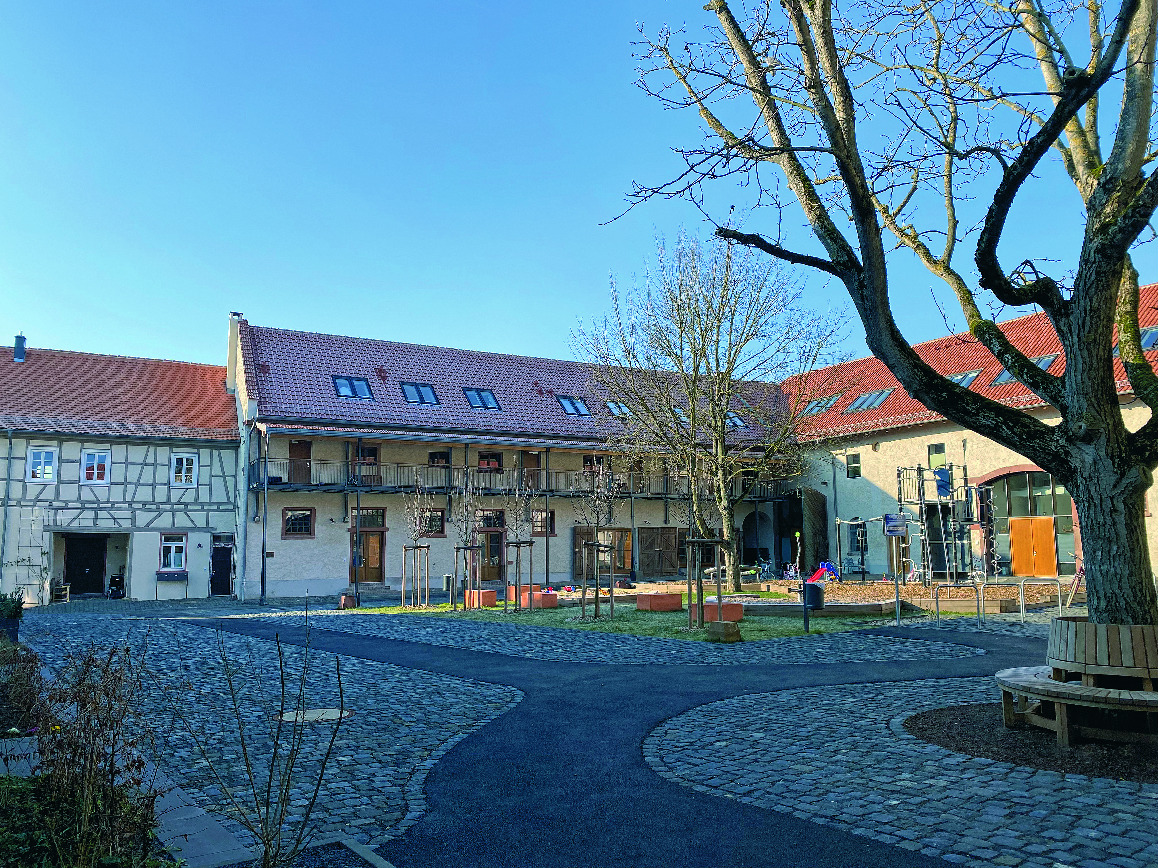 Um die Idee eines gemeinschaftlichen Wohnens und Arbeitens vielfältig zu realisieren, entstand ein heterogenes Nutzungskonzept aus barrierefreien Wohnungen, öffentlichen sozialen Einrichtungen und Gewerbe sowie attraktiven Außenanlagen. Eine Bibliothek, ein Jugendzentrum, ein Restaurant, kreative Ateliers sowie junges Gewerbe sind bislang in das Kulturdenkmal eingezogen. Das Architekturbüro acr+ unter Leitung der Architektin Antje Riedl entwickelte seit 2008 ein Nutzungskonzept für den zuvor als landwirtschaftlichen Betrieb genutzten und anschließend mehrere Jahre leerstehenden Dreiseithof. Bei der Ausführung stand eine Architektur der Nachhaltigkeit und Ressourcenschonung im Mittelpunkt.