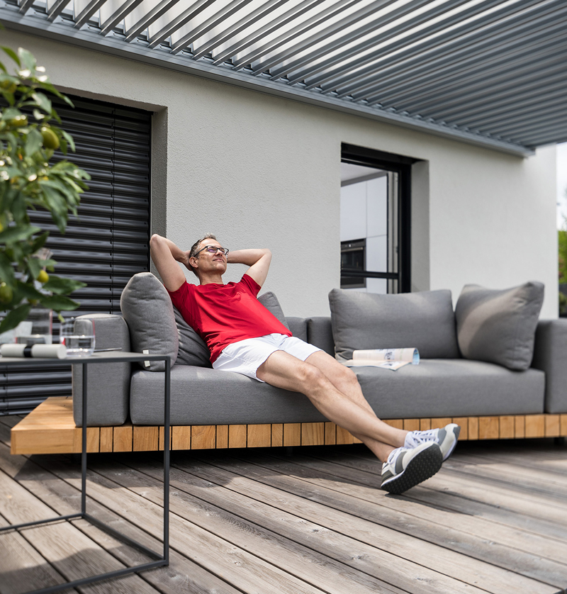 Im Mittelpunkt der Neuheiten Präsentation steht die »Bella Lamella«, die neue Terrassenüberdachung von Reflexa mit sich bis zu 110 Grad öffnenden Lamellen. Das Lamellendach »Bella Lamella« besteht aus Aluminium und verfügt über ein Dach, dessen Lamellen sich für eine optimale Atmosphäre an den gewünschten Lichteinfall anpassen lassen. Die Terrassenlösung ist laut Reflexa 100 Prozent wasserdicht und mit einer zulässigen Schneelast von 112 kg / m2 solide und allwettertauglich. Ab April 2021 ist die »Bella Lamella« bei Reflexa erhältlich.