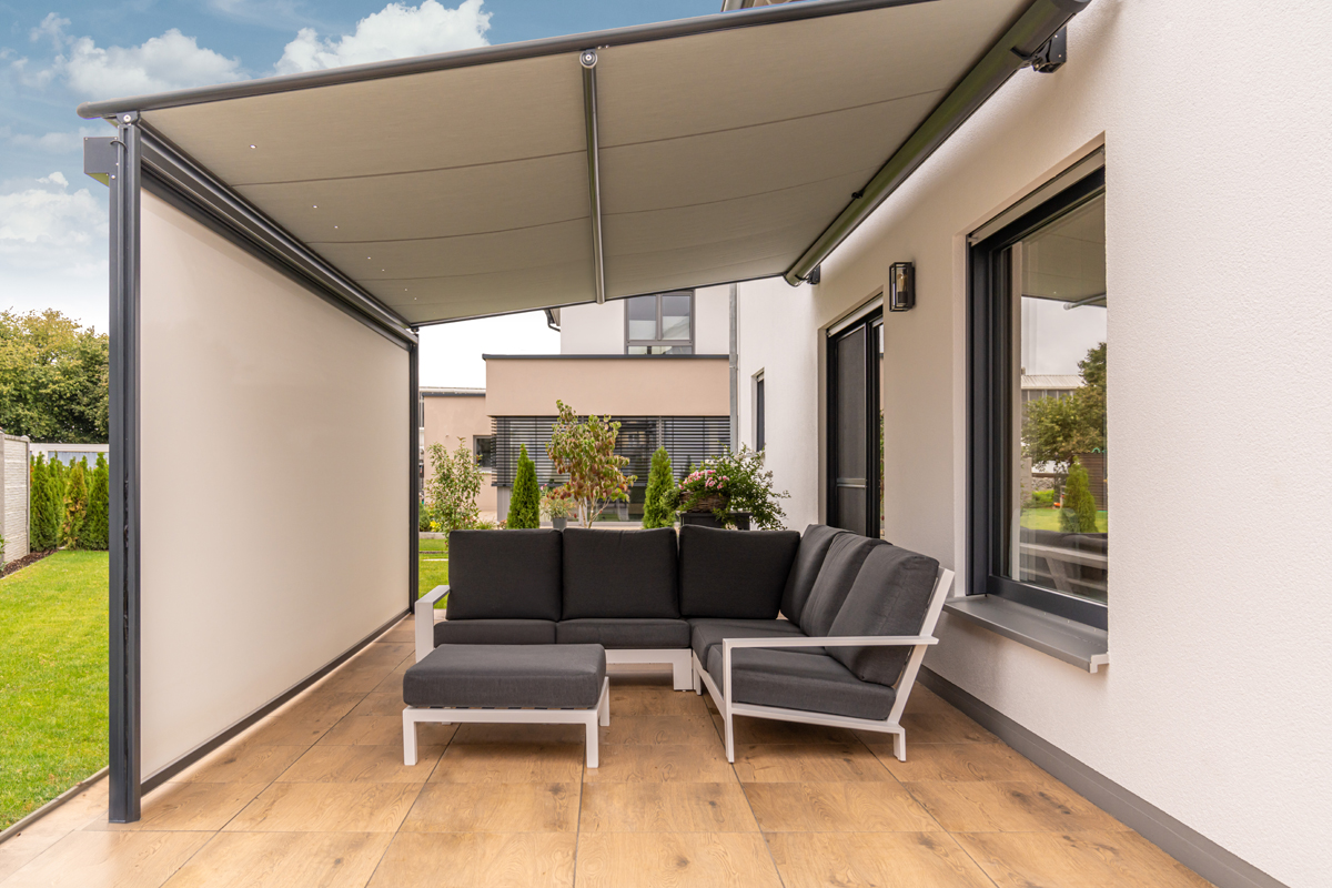 Gegen unerwünschte Einblicke, Wind und tiefstehende Sonne bietet Reflexa zudem ausfahrbare Senkrechtmarkisen passgenau zu allen Reflexa-Terrassenüberdachungen. Die Stoffe gibt es in vielen Designs und Ausführungen von blickdicht über halb- bis ganz transparent. Sie sind dank Zip-Technologie windstabil und fest in den Führungsschienen verankert. Das eingefahrene Tuch ist zudem vor Wettereinflüssen geschützt.