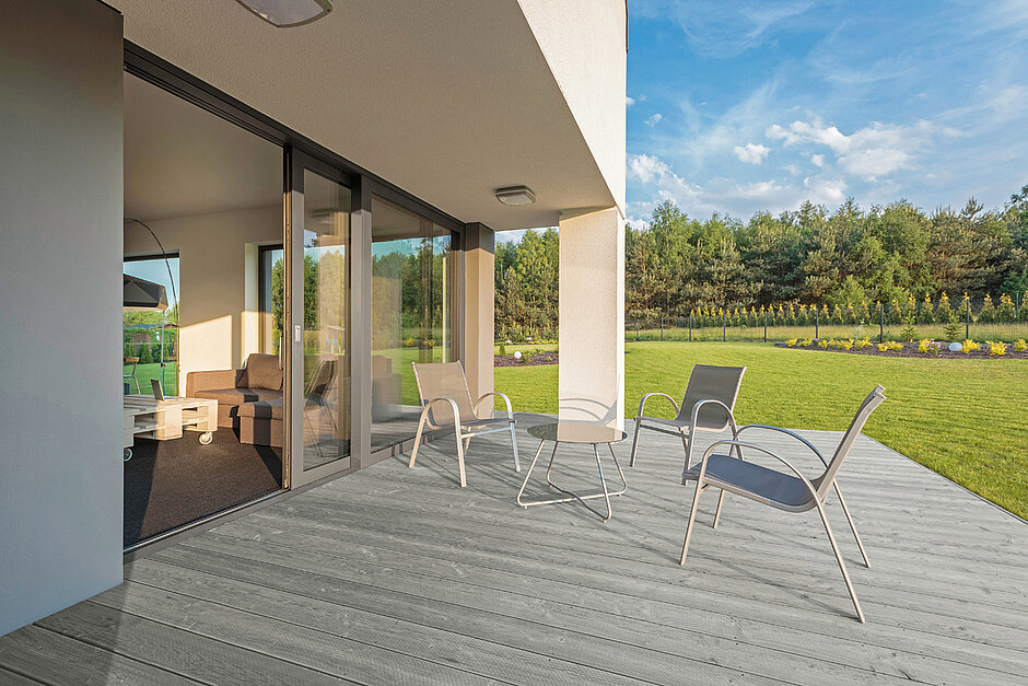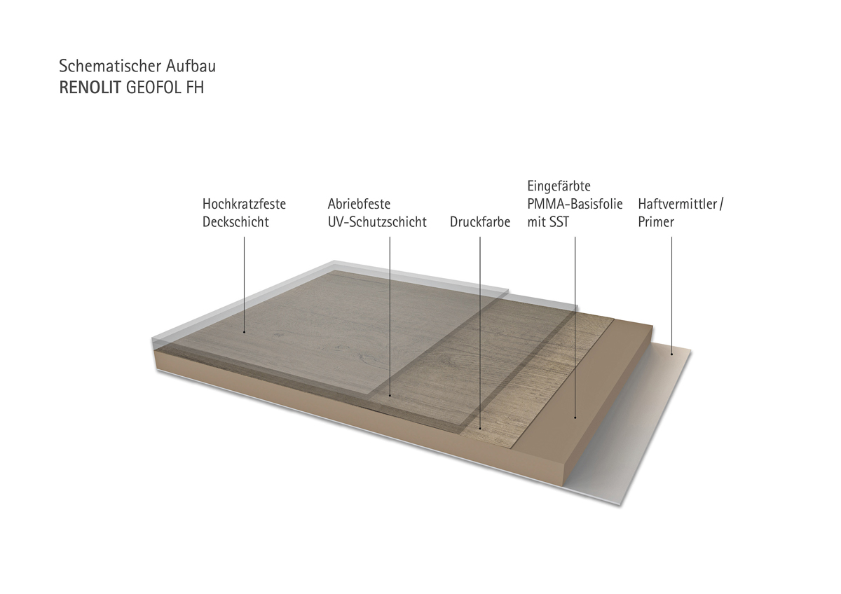 David Sagerer, verantwortlich für Produktmanagement und Technik, beschreibt die Besonderheiten der Neuentwicklung wie folgt: »Für die Abriebfestigkeit sorgen Korundbestandteile, für die notwendige Rutschfestigkeit und Trittsicherheit eine raue Oberflächenstruktur.« Die Basis für »Renolit Geofol FH« bildet eine durchgefärbte PMMA-Folie, die – wie alle Außenfolien des Unternehmens – mit der »Solar Shield Technology« (SST) ausgerüstet wird. IR-reflektierende Farbpigmente schützen sowohl die Profile als auch die Folie selbst vor übermäßiger Erwärmung. In den westeuropäischen Märkten bietet Renolit eine Gewährleistung von bis zu zehn Jahren an, die sich auch auf die Farbechtheit erstreckt – nach Unternehmensangaben ein Novum im Bereich industriell erzeugter Fußbodenpaneele für den Außenbereich.