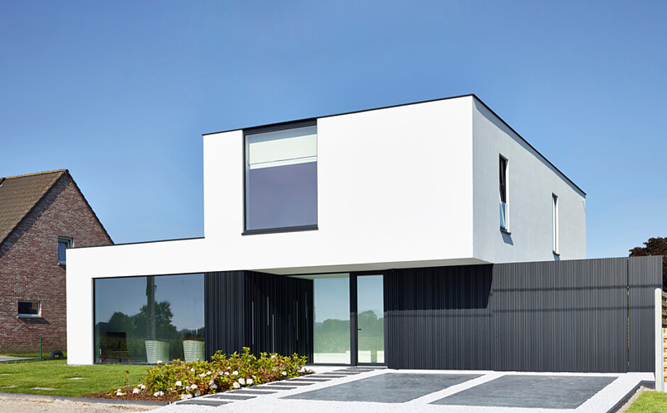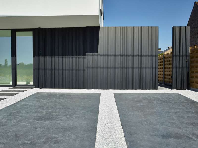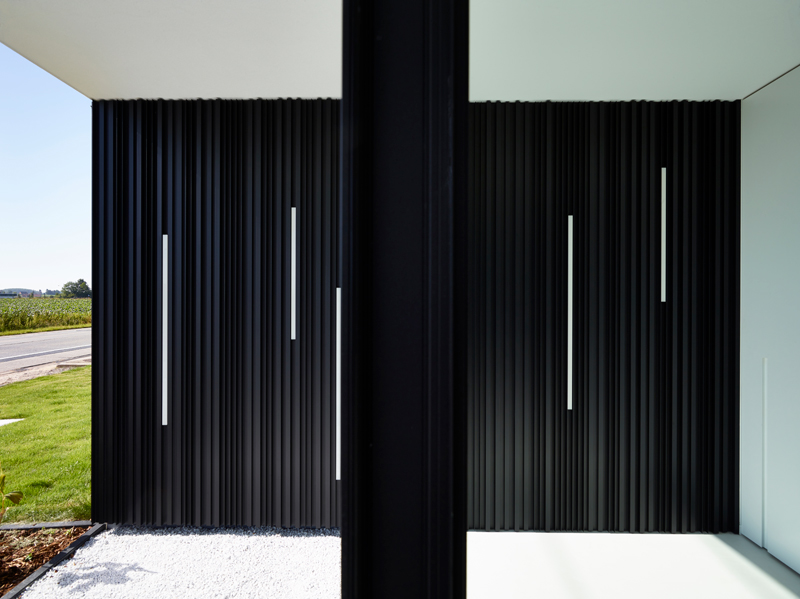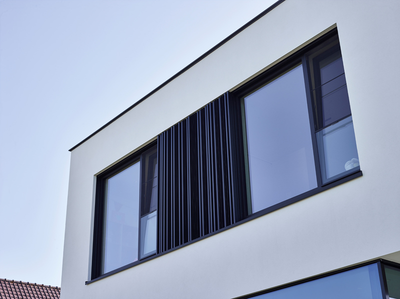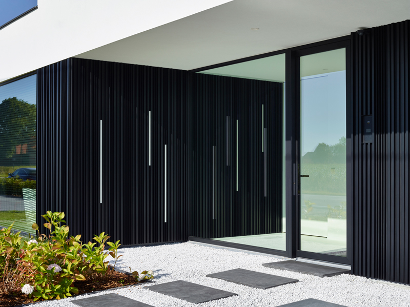 An der Vorderseite des Gebäudes dominiert die senkrechte Fassadenverkleidung »Linarte« aus Aluminiumprofilen, die auf der anderen Seite der Glasfront neben der Tür nahtlos weiterläuft. »Auf diese Art und Weise bildet außen eine Einheit mit innen«, erläutert Nele Delva. Die Entscheidung für Aluminium fiel zum einen aus ästhetischen, zum anderen auch aus praktischen Gründen, da die Bauherren eine wetterunempfindliche und wartungsfreundliche Fassade wünschten.