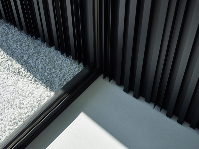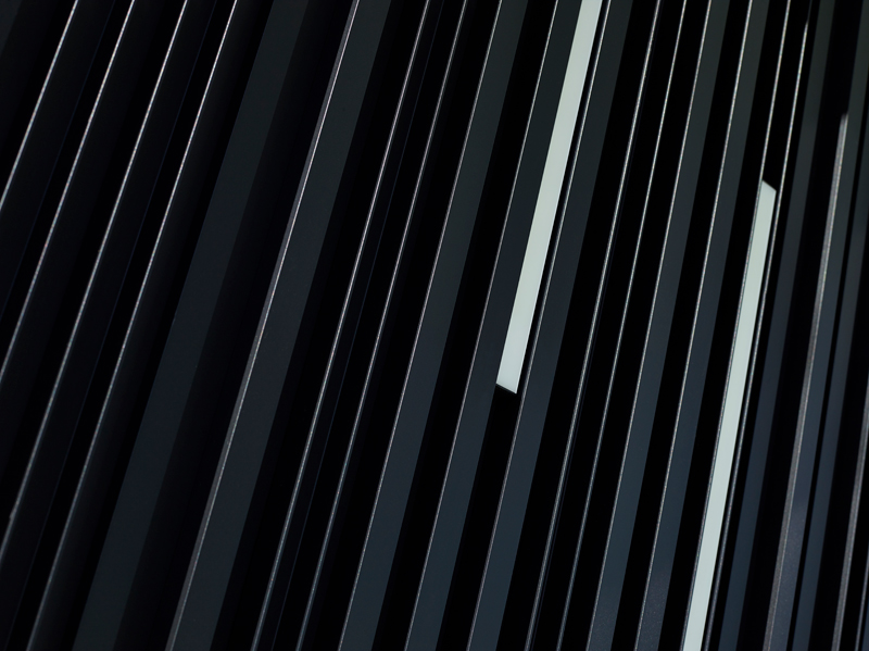Die Architektin nutzte dabei die Möglichkeit, unterschiedlich lange »Linarte«-Fassadenprofile einzusetzen. So könne man als Architekt der eigenen Kreativität freien Lauf lassen. Das Ergebnis ist in diesem Fall eine Kombination aus »Even« und »Block«-Profilen, die letzte Variante sowohl in der 16 mm, als auch in der 30 mm tiefen Version. Das Schiebetor wurde mit den gleichen »Linarte«-Profilen verkleidet. Auch LED-Strips konnten in die Fassade integriert werden. J