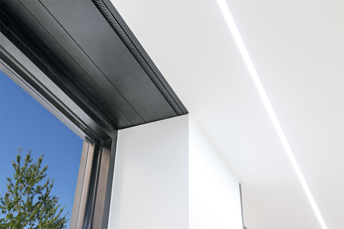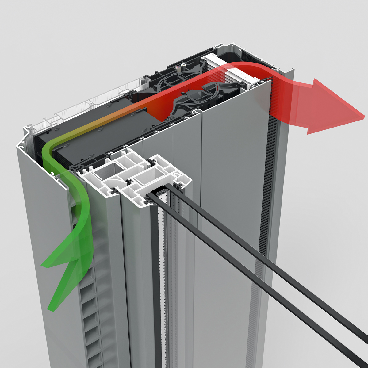 Die zentrale Einheit der »Endura Twist« ist 110 mm hoch, 345 mm breit und bis zu 6 000 mm lang, womit sie laut Hersteller auch für große Schiebefenster-Systeme oder Glasfronten geeignet ist. Je nach Einbausituation, integriert oder sichtbar, sind unterschiedliche Luftführungen in den Innenraum möglich: nach oben, nach unten oder zur Seite. Das System lässt sich ohne Filter betreiben, aber bei Bedarf auch mit G3-Filtern oder F7-Feinstofffiltern ausrüsten. Um den unterschiedlichsten Lüftungsbedürfnissen von kleinen wie großen Räumen mit wenigen oder vielen Fenstern gerecht werden zu können, hat Renson das Lüftungssystem modular so aufgebaut, dass je nach Lüftungsbedarf ein bis sechs Lüftungsmodule zum Einsatz kommen. Pro Modul wird eine Luftwechselrate von 15 m³ pro Stunde erzielt. So lässt sich bei Einsatz von sechs Lüftungsmodulen pro Fenster eine nominale Luftwechselrate von bis zu 90 m³ pro Stunde erreichen. Mithilfe der Boost-Funktion lassen sich laut Hersteller sogar bis zu 180 m³ pro Stunde lüften.