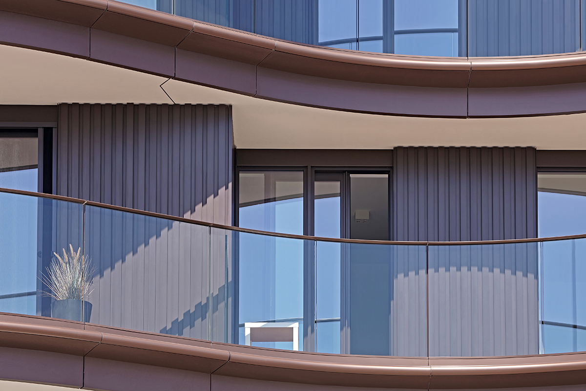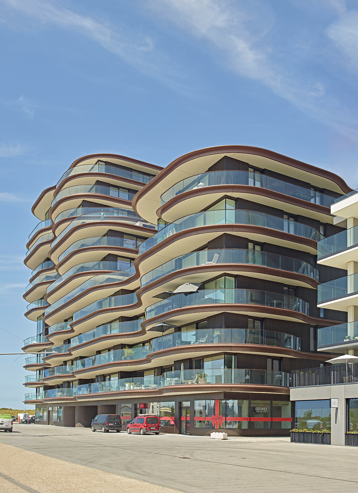 Im historischen Hafen von Ostende steht das ikonische Eckgebäude »One Baelskaai«. Es erhielt von Binst Architects wellenförmige Terrassen und ausdrucksstarke Terrassenkanten. Die Architekten wählten die braunschwarz-bronzefarbene Profilverkleidung »Linarte« von Renson, die an das Dünengras und die Dünenzäune erinnert und mit den fließenden horizontalen Linien kontrastiert.
