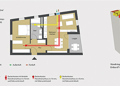 Dies bedeutet aber auch, dass unbenutzte Zimmer keine Energie für Frischluft benötigen. Erst wenn der Raum benutzt wird und die CO2-Werte steigen, springt die kontrollierte Lüftung an. Damit die Luftqualität bestmöglich kontrolliert werden kann, wurden die CO2-Sensoren (andere mögliche Sensoren: VOC und Feuchtigkeit) im Heiz-Kühl-Paneel installiert. An den Austrittdüsen der Anlage kann der Sensor die Qualität der Raumluft bestmöglich messen. Jede Anlage ist für sich eigenständig, nur für Frischluft zuständig und im Hotel nur CO2-gesteuert. Die Sensoren sind für Gäste unzugänglich im Umluft-Kanal integriert.