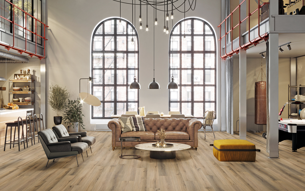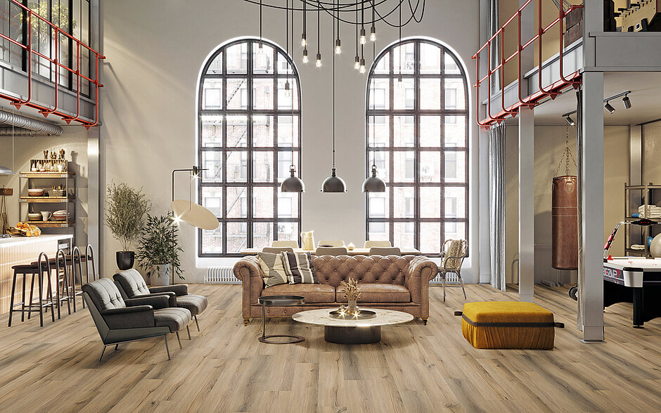 Mit einem Glanzgrad von nur drei bis vier Prozent besticht die neue Kollektion durch eine elegante natürliche Optik. Die Böden sind zu 100 Prozent wasserfest und somit gut für feuchte Bereiche wie Küchen und Badezimmer geeignet. Für eine komfortable und ruhige Raumakustik sorgt die integrierte Kork-Unterlage, während die vierseitige Fase den Böden eine elegante Definition und einen dekorativen Übergang zwischen den einzelnen Planken verleiht.