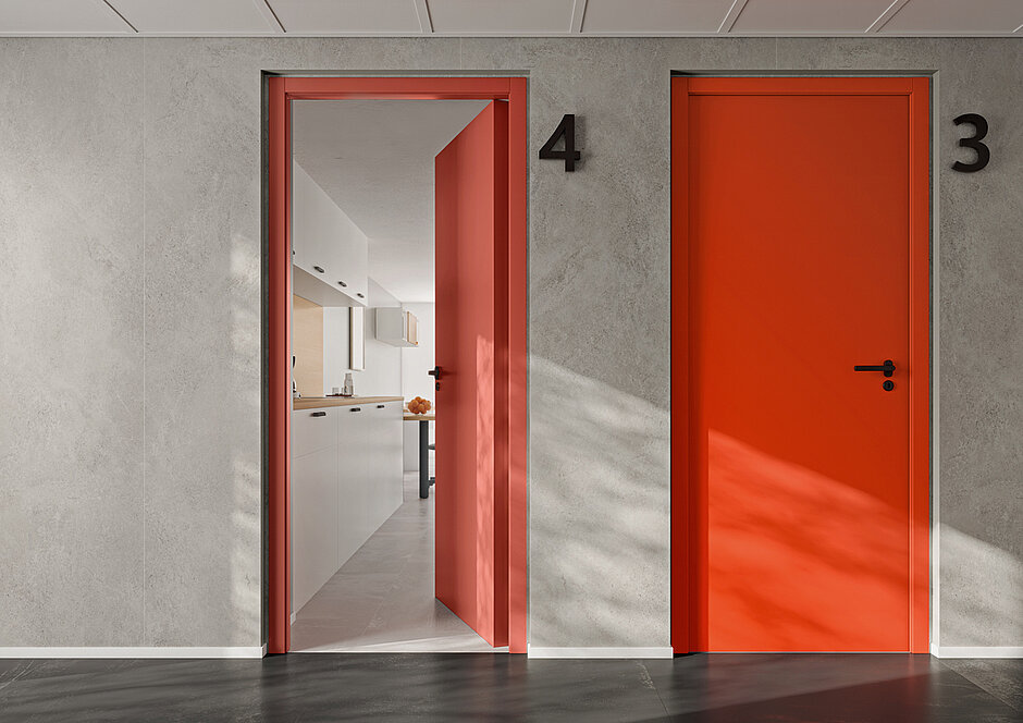 Dank der großen Auswahl an verfügbaren Größen lässt sich eine Vielzahl an Türvarianten realisieren: Von Standardtüren über Doppeltüren bis hin zu maßgeschneiderten Lösungen wie überbreiten Schiebetüren in medizinischen Einrichtungen oder raumhohe Ausführungen in repräsentativen Büros. Mit der neuen Formatauswahl und den neuen Dekor- und Oberflächenvarianten lassen sich mit HPL Türen harmonisch an jeden Raum anpassen.