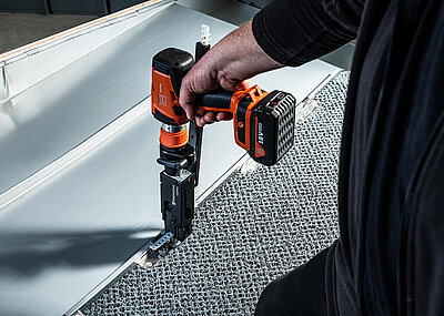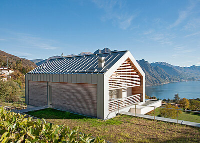 Die Bekleidung von Dach und Fassade erfolgte mit Rheinzink-Großrauten. Durch die Verwendung unterschiedlicher Rautengrößen und verschiedene Anordnungen der Falzlinien bieten sich dem Planer vielfältige Möglichkeiten der Fassadengestaltung. Die Rauten im 1/3-Versatz prägen die Außenansicht des außergewöhnlichen Wohnhauses und erzeugen bei wechselnden Licht- und Witterungsverhältnissen eine lebendige Textur.