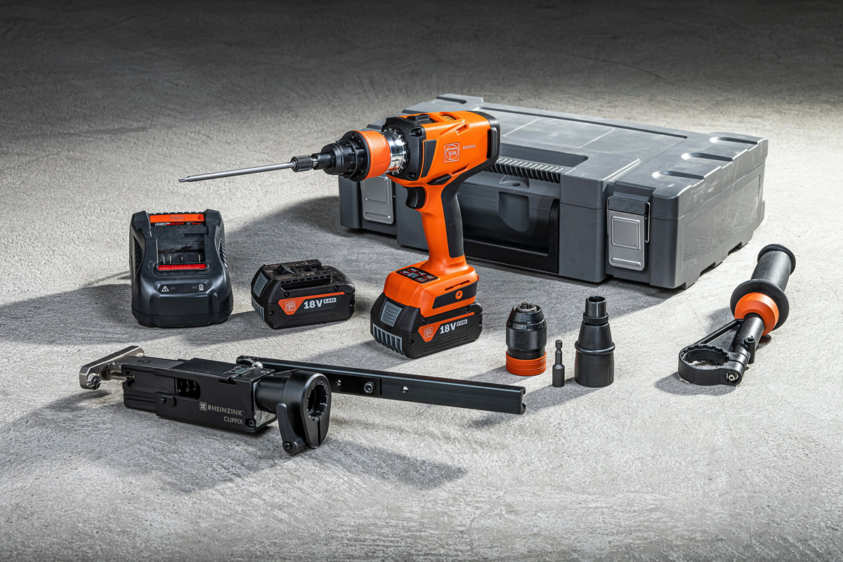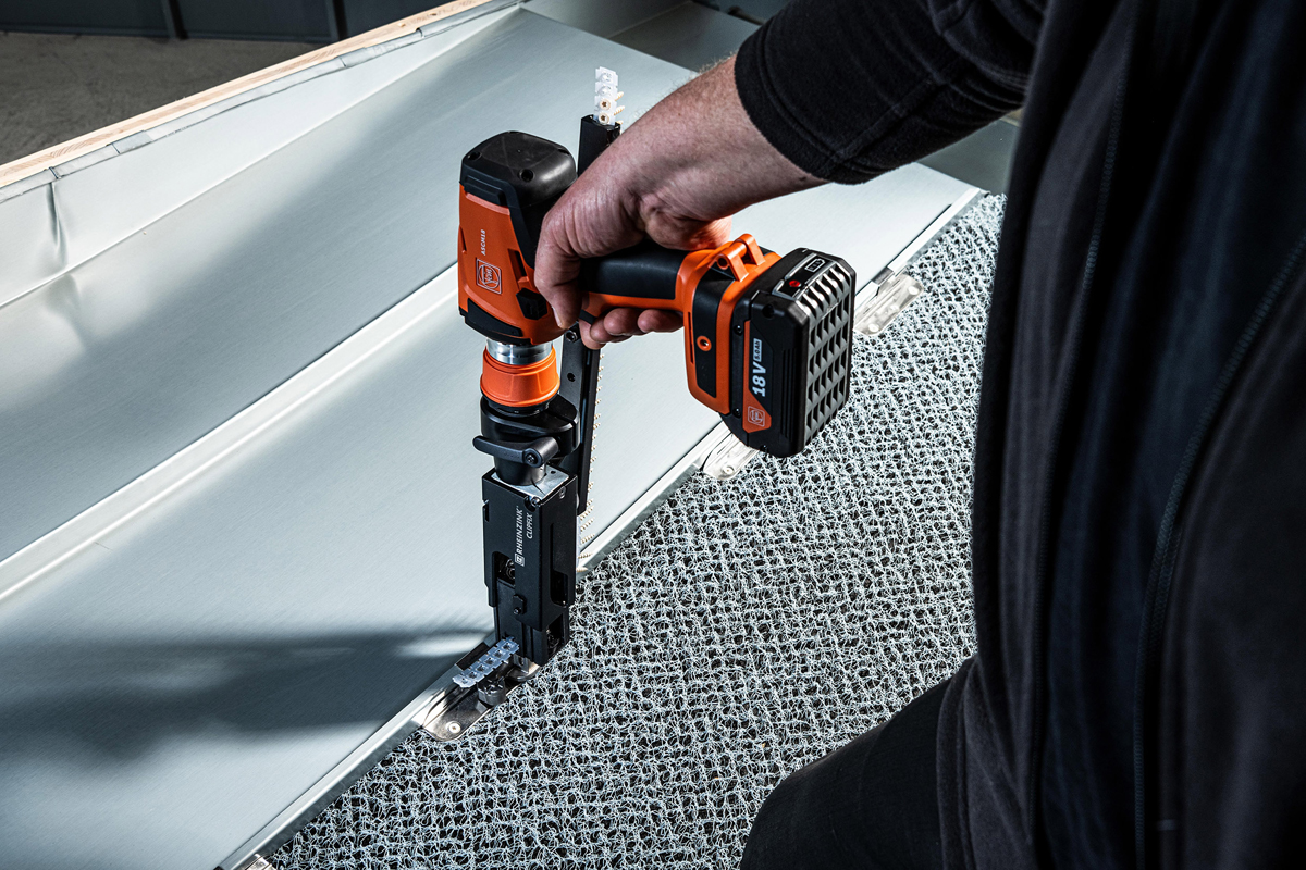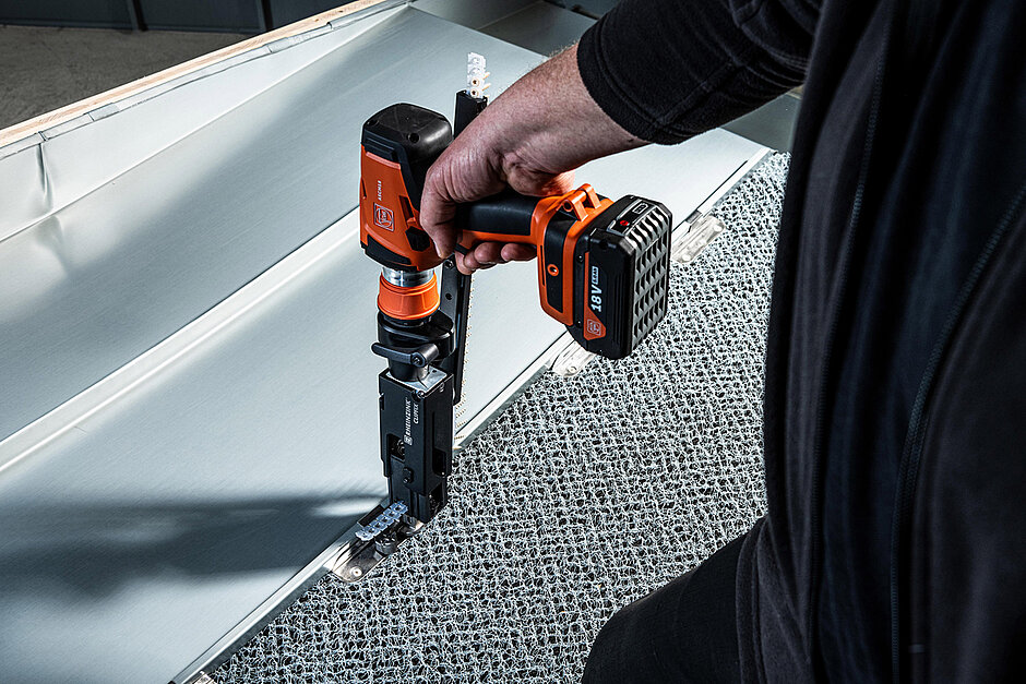 Der »Clipfix 3in1« basiert auf dem Fein-Akku-Bohrschrauber »ASCM 18-4 QM AS« mit bis zu 130 Nm Drehmoment. Das Viergang-Vollmetallgetriebe und die elektronische Drehmomenteinstellung sorgen für präzises Arbeiten. Der Aufsatzwechsel erfolgt sekundenschnell über die »QuickIN«-Schnittstelle. Weitere Ausstattungsmerkmale sind eine Kickback-Kontrolle sowie eine dimmbare LED für sicheres Arbeiten auch bei schlechten Lichtverhältnissen. Der Schrauber ist kompatibel mit Bosch-Professional-18-V-Akkus ab Baujahr 2008. Gemeinsam mit den bauaufsichtlich zugelassenen Befestigungshaften aus Edelstahl, den speziell entwickelten Schrauben und den Stehfalzscharen von Rheinzink ist der »Clipfix 3in1« ein wichtiger Baustein des bewährten Stehfalzsystems. Beim Einsatz aller Systemkomponenten gewährt Rheinzink 40 Jahre Garantie auf die Lastaufnahme der Haften.