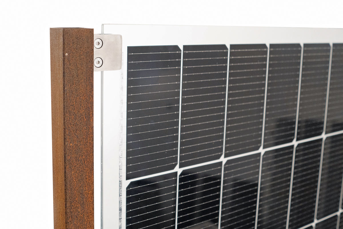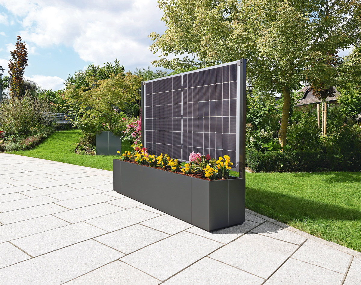 Die Solarmodule werden mittels Klemmhalter mit Edelstahlplatten an beiden Enden des Kastens sicher im Rahmen gehalten. Das Komplettpaket inkl. vormontiertem 400-Watt-Wechselrichter ist nach dem Aufstellen und dem Anschluss an das Stromnetz sofort einsatzbereit. Dank der Begrünung innerhalb des Pflanzkastens und der sich daraus ergebenden Beschwerung wird eine sichere Aufstellung gewährleistet. Die Gesamtkonstruktion bietet einen Sichtschutz von etwas mehr als 3 m2 mit einer Länge von 1 890 mm und einer Höhe von 1 650 mm. Dabei weist der Pflanzkasten eine Breite von 440 mm und eine Höhe von 400 mm auf. Die 8 mm starken Solarmodule decken eine Fläche von rund 2 m2 zur reinen Energiegewinnung auf 1 766 mm x 1 165 mm ab.