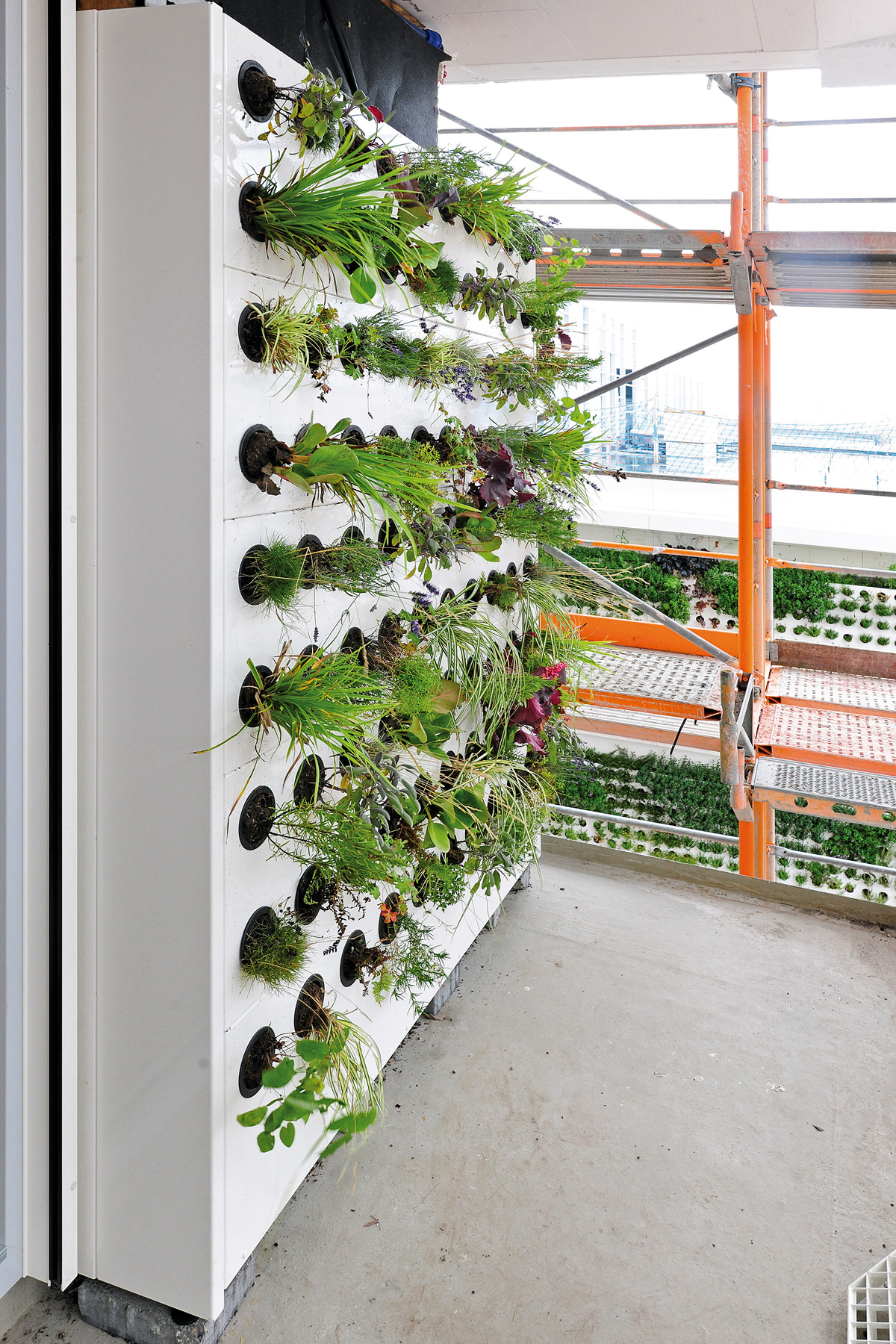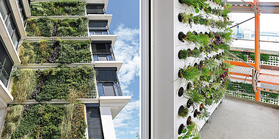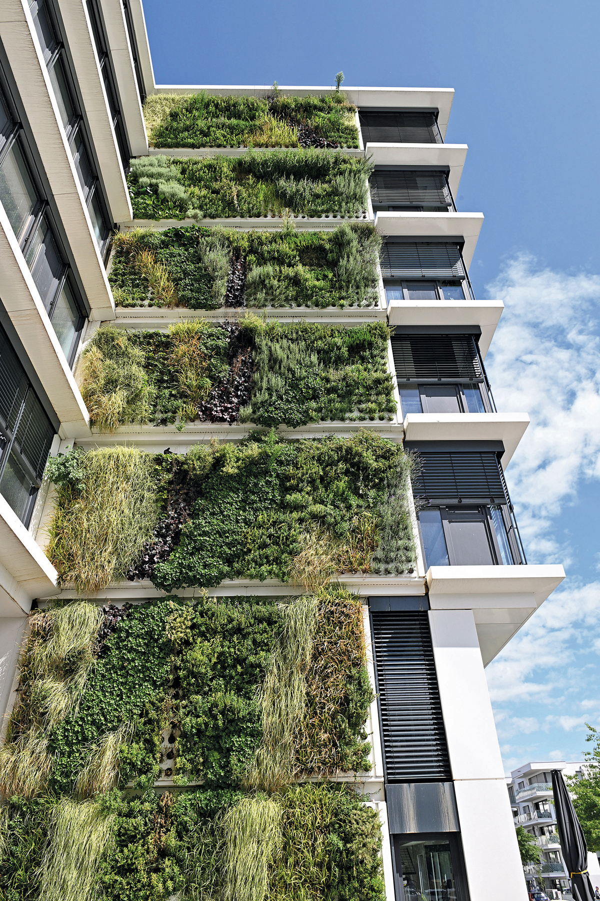 Der insgesamt vier Gebäudeteile umfassende »Green City Tower« am alten Zollhof in Freiburg vereint Büro-, Gastronomie- und Wohnflächen in einem einzigartigen Komplex. Während drei der Bauten über vier, fünf und sieben Etagen verfügen, erstreckt sich der Wohnturm über 15 Obergeschosse insgesamt 52 Meter in die Höhe. Nicht weniger als 4 300 m2 und damit rund zwei Drittel der gesamten Fassadenfläche des Wohnturms wurden mit einer wandgebundenen Begrünung versehen. In dieser Dimension ist die Maßnahme am »Green City Tower« eine der größten vertikalen Vegetationsflächen in ganz Deutschland mit einem CO2- Bindevermögen von 20 t bis 25 t pro Jahr.
