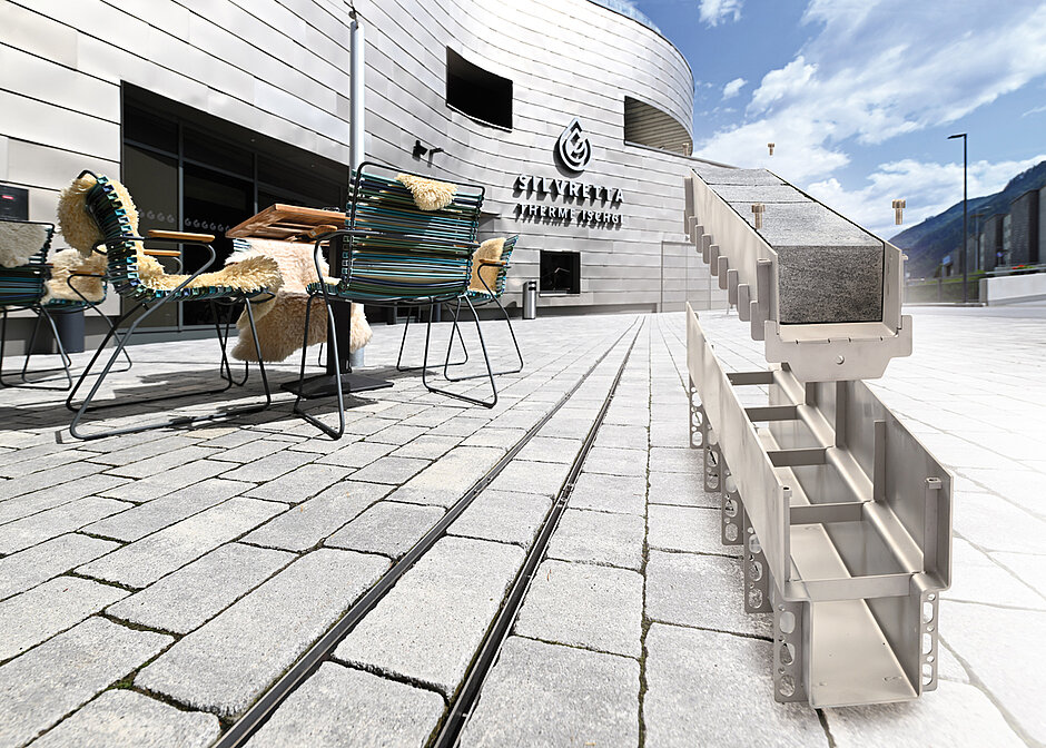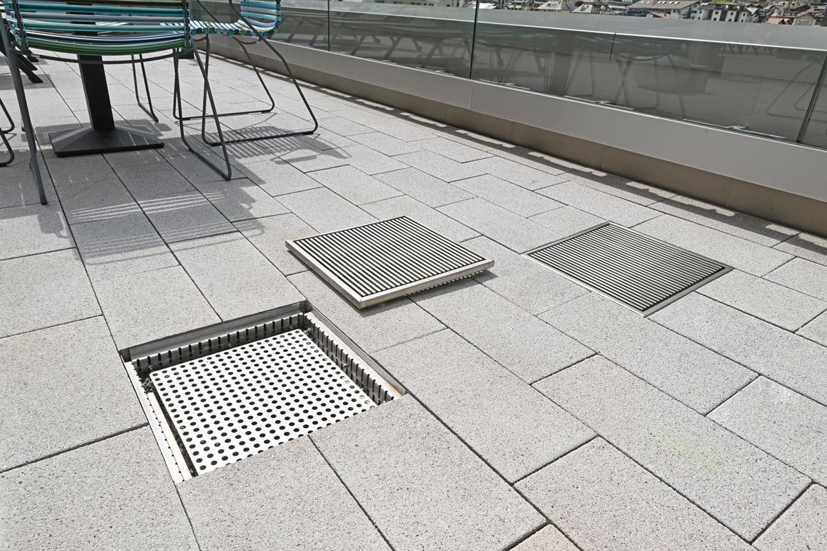Besonders auf den gepflasterten Außenterrassen kommen Gäste in den Genuss der eindrucksvollen Naturlandschaft. Insgesamt umfasst das Außen-Areal eine Fläche von ca. 2 500 m², wovon rund 1 900 m² mit Pflastersteinen versehen wurden. Für diese Maßnahme zeichnete die Firma Ofenbau Tschiderer aus Pians verantwortlich. Die Firma setzte im selben Zuge die Montage verschiedener Lösungen zur Drainage und Entwässerung der Terrassenflächen um. Denn aufgrund der exponierten Hanglage der Therme waren Planung und Umsetzung eines leistungsstarken Regenwassermanagements unerlässlich: »In der Region ist mit starken Niederschlägen in Form von Regen oder Schnee zu rechnen. Entsprechend bedurfte es funktionaler Lösungen, die in der Lage sein sollten, Regen oder Wasser infolge einer Schneeschmelze aufzufangen und kontrolliert abzuleiten«, erläutert Norbert Tschiderer, Geschäftsführer von Ofenbau Tschiderer. Darüber hinaus waren im Bereich der Einfahrt und des Eingangs für aufkommenden Gäste- und Anlieferungsverkehr sowie für mögliche Schneeräumungen mithilfe schwerer Gerätschaften auch Produkte in Schwerlastausführung gefragt.