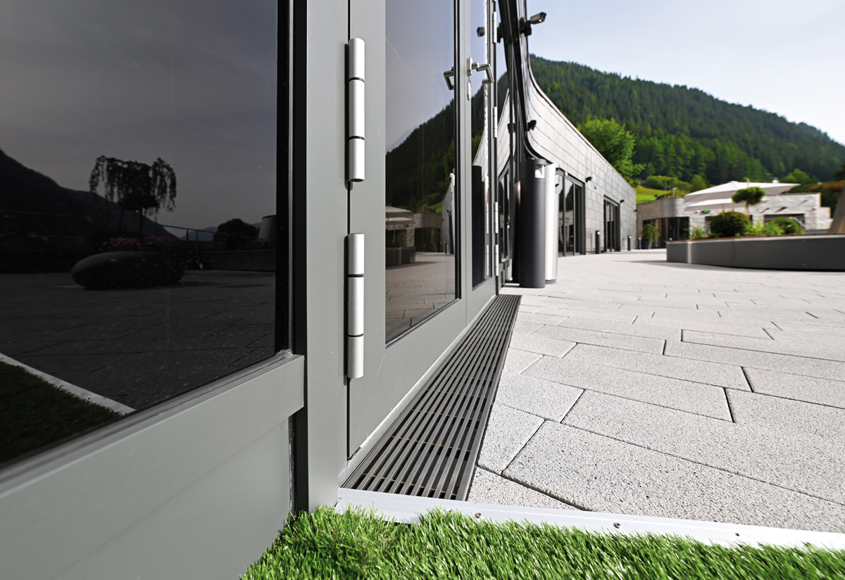 Sowohl an der Schwelle des Eingangsbereichs als auch entlang mehrerer Türbereiche auf den Außenterrassen der Outdoor-Pools montierte das Team von Ofenbau Tschiderer höhenverstellbare Drainagerinnen des Typs »Hydra«, die zum Teil individuell auf Maß gefertigt wurden. Dank der stufenlosen Höhenangleichung war es möglich, die Drainagerinnen mit nur wenigen Handgriffen an die örtlichen Gegebenheiten anzupassen und einen barrierefreien Übergang zwischen Innen- und Außenbereich zu realisieren. Auf die Rinnenlängen und -breiten abgestimmte Edelstahl-Roste verleihen den Drainagerinnen optisch einen zeitlos eleganten Abschluss. Die 7 x 7 mm starken Längsstäbe greifen die Linienführung der Fassadenbereiche gekonnt auf und reflektieren einfallendes Licht auf ansprechende Weise. Auch funktional sind sie die geeignete Wahl, da die Stäbe problemlos mit bloßen Füßen beschritten werden können.