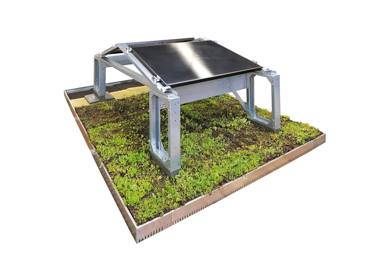 So steht für die »Miralux Flex«-Systeme in Ost-West-Ausrichtung eine zusätzliche Aufständerung zur Verfügung. Diese ermöglicht neben der Erstbepflanzung von Gründächern in Kombination mit Photovoltaikanlagen auch eine Nachrüstung bereits bestehender extensiver Dachbegrünungen mit Solarmodulen. Unterhalb der Aufständerungen werden diese mit den erforderlichen Ballastierungssteinen verschraubt.