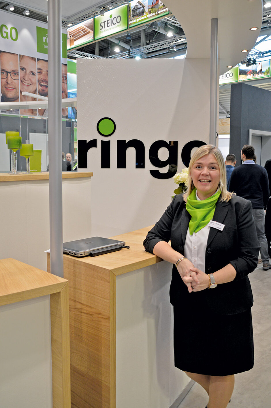 Der Rundgang über den Messestand mit Stefanie Röttgers, bei Ringo für das Marketing zuständig, beginnt an einer Tür für Besprechungsräume, die allein durch ihre Türblattstärke von 106 mm verhindert, dass Vertrauliches nach außen dringt. »Mit Schallschutzklasse 5 eignet sich dieses Modell besonders für Kanzleien und Arztpraxen«, erläutert sie. Drei Bänder halten diese 136 kg schwere Tür, die montagefreundlich in Einzeteilen transportiert und dann erst vor Ort zusammengebaut wird.