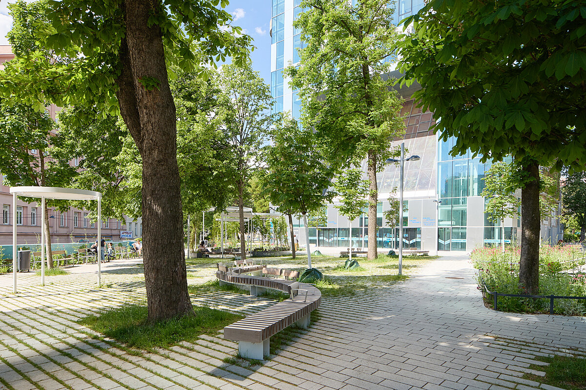 Der erste »Cooling Park« der Stadt Wien wurde bereits im Jahr 2020 gebaut. Es handelt sich dabei um das Projekt Esterhazypark am Haus des Meeres, geplant von Carla Lo Landschaftsarchitektur, Wien. Die Bodenflächen sind entsiegelt und begrünt. Mit natürlicher Einfachheit entsteht ein Sprung zwischen repräsentativem Außenraum und innerstädtischem Grünraum, in dem das Gras seinen Platz zwischen den Fugen findet. Es wurden Bäume gesetzt, und fast 3 m hohe Nebelduschen kühlen bei Hitze die Umgebung mit einem feinen Sprühnebel – gefühlt um bis zu 6 °C – und unterstützen das Mikroklima.