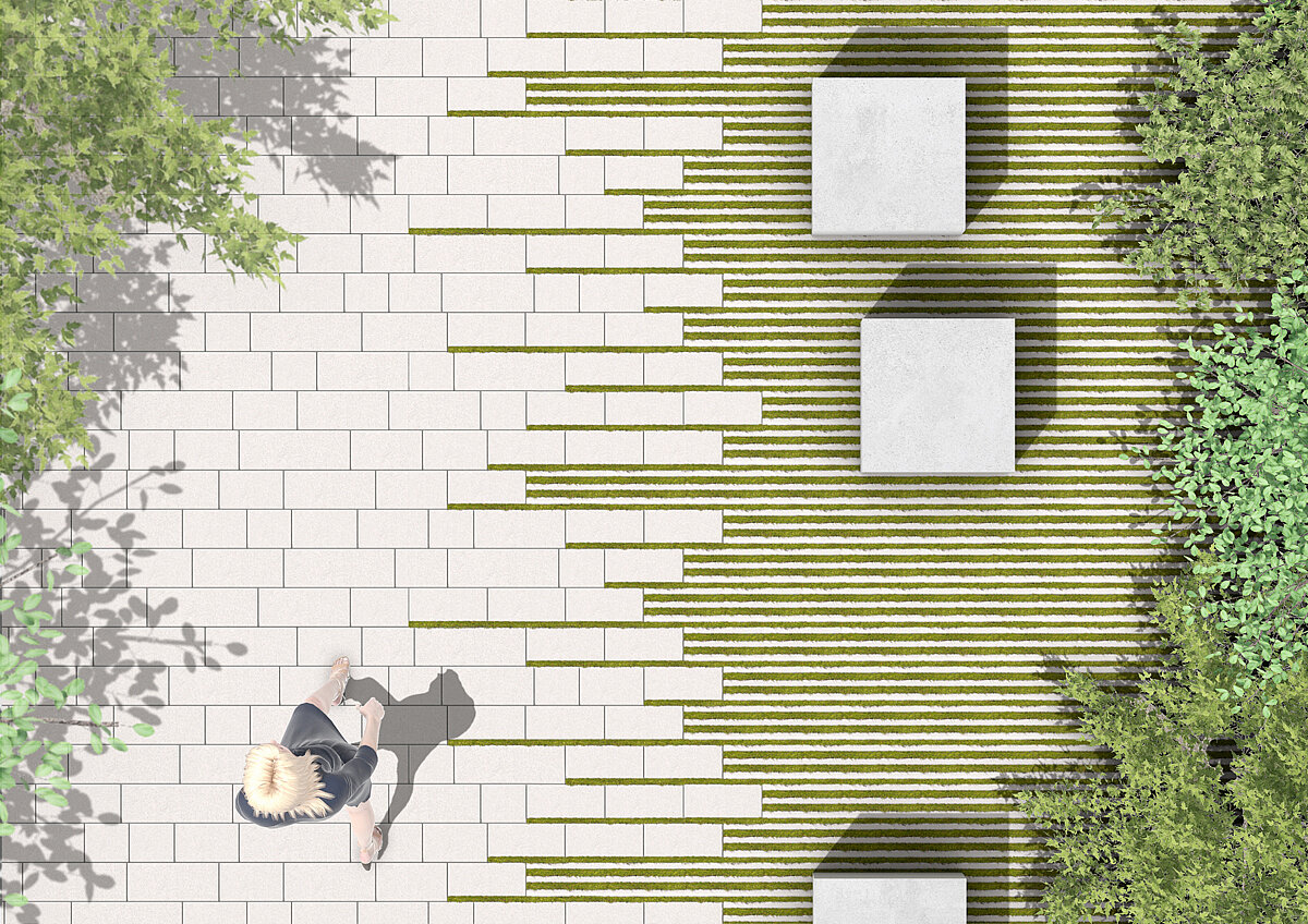 Die Herausforderungen des Klimawandels verlangen neue Konzepte, die dabei helfen, die Gegensätze von Hitzestaus, Regenereignissen und mangelnder Begrünung auszugleichen. Studien zum Thema Stadtklima favorisieren das Schwammstadt-Prinzip, bei dem Bodenbeläge mit hohem Grünanteil als »Schwamm« fungieren. Regenwasser wird in den offenen Grünfugen gespeichert und kann gut verdunsten bzw. kontrolliert in das Grundwasser versickern.