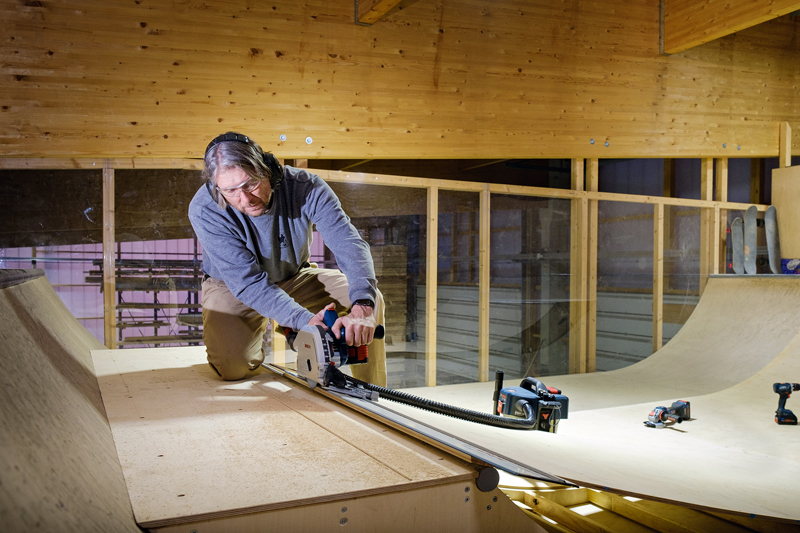 »Mit der Handkreissäge habe ich 24er Multiplex-Platten nicht gerade, sondern in Radien geschnitten.« Andreas Schützenberger liebt den »Freestyle« und verlangt das auch von seinem Werkzeug – in diesem Fall von der »GKS 18V-68 GC Professional«. Im Stresstest beweise sie sich als Dickhäuter und überzeuge auch im Detail: »Die bequeme Tiefeneinstellung per Knopfdruck oder ein Anschluss für die Absaugung, der genau da ist, wo er hingehört und dich nicht beim Arbeiten stört – das sind Sachen, auf die leg‘ ich großen Wert.« Das positive Gefühl, wenn ein Werkzeug bequem in der Hand liegt, schätzt der Skaterampenbauer auch beim Winkelschleifer der Serie, dem »GWX 18V-15 SC Professional«: »Der hat wirklich ein gutes Handling und echte Durchzugskraft. Der Akku gibt nicht auf, zieht durch. Und: Ich kann die Drehzahl per Knopfdruck direkt oben am Gerät einstellen. Mit dem macht das Arbeiten Spaß!«