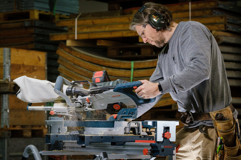 Auch die Biturbo-Tauchsäge »GKT 18V-52 GC Professional« sorgt für kabellose Freiheit. Sie passt laut Hersteller auf nahezu jede Führungsschiene und sei mit elf Millimetern Wandabstand Klassenbeste. So kann der Skaterampenbauer besonders randnah arbeiten. Die Entscheidung, ob ein Akku-Werkzeug mit auf die Baustelle darf, hängt bei Andreas Schützenberger zudem vom einfachen Transport ab. Hier punkten sowohl die Tauchsäge als auch die »GCM 18V-216 Professional«, die erste Akku-Kapp- und Gehrungssäge von Bosch. Beide Sägen werden wie alle Biturbo-Geräte mit nur einem Akku betrieben – auch ihre Kompaktheit überzeugt den Profi: »Selbst die Kapp- und Gehrungssäge nehm‘ ich mit einem Griff einfach und bequem auf die Baustelle mit.« Gleichzeitig freut er sich über das breite Schnittportfolio, das ihm die Säge mit 70 mm Schnitttiefe bietet – denn er ist heute schneller vorangekommen als gedacht. Die mobile Rampe steht und ist bereit für einen Test durch den Meister. J