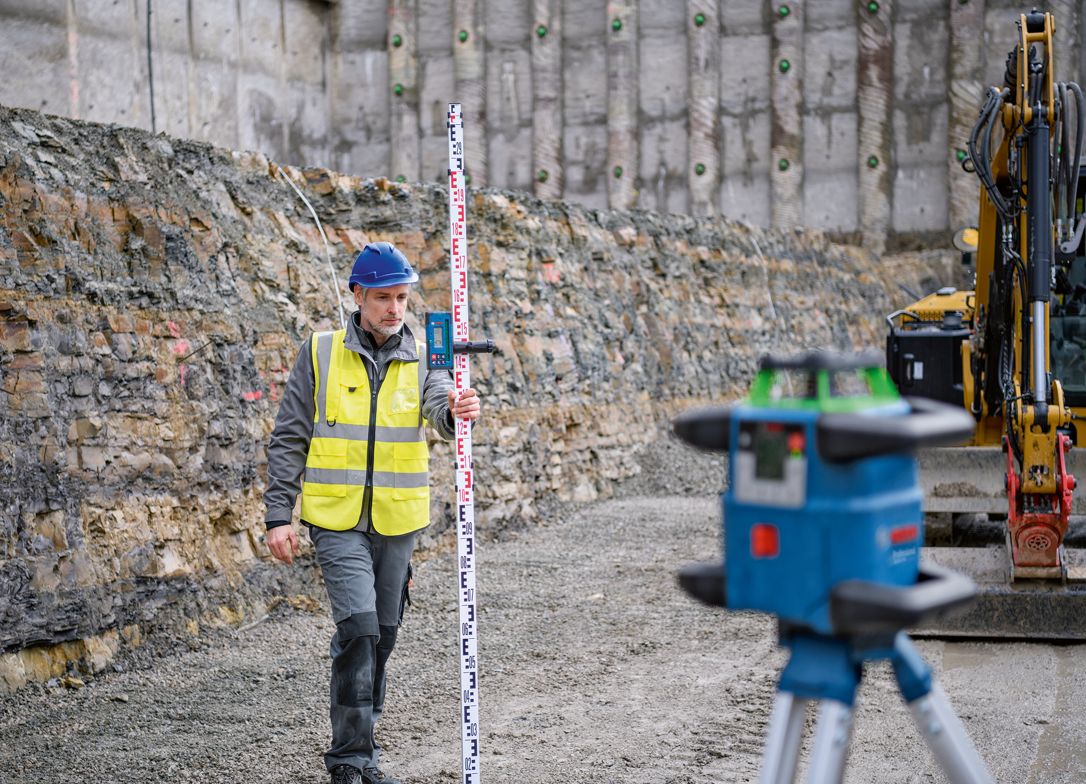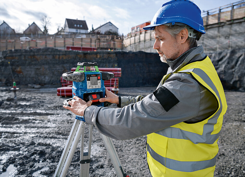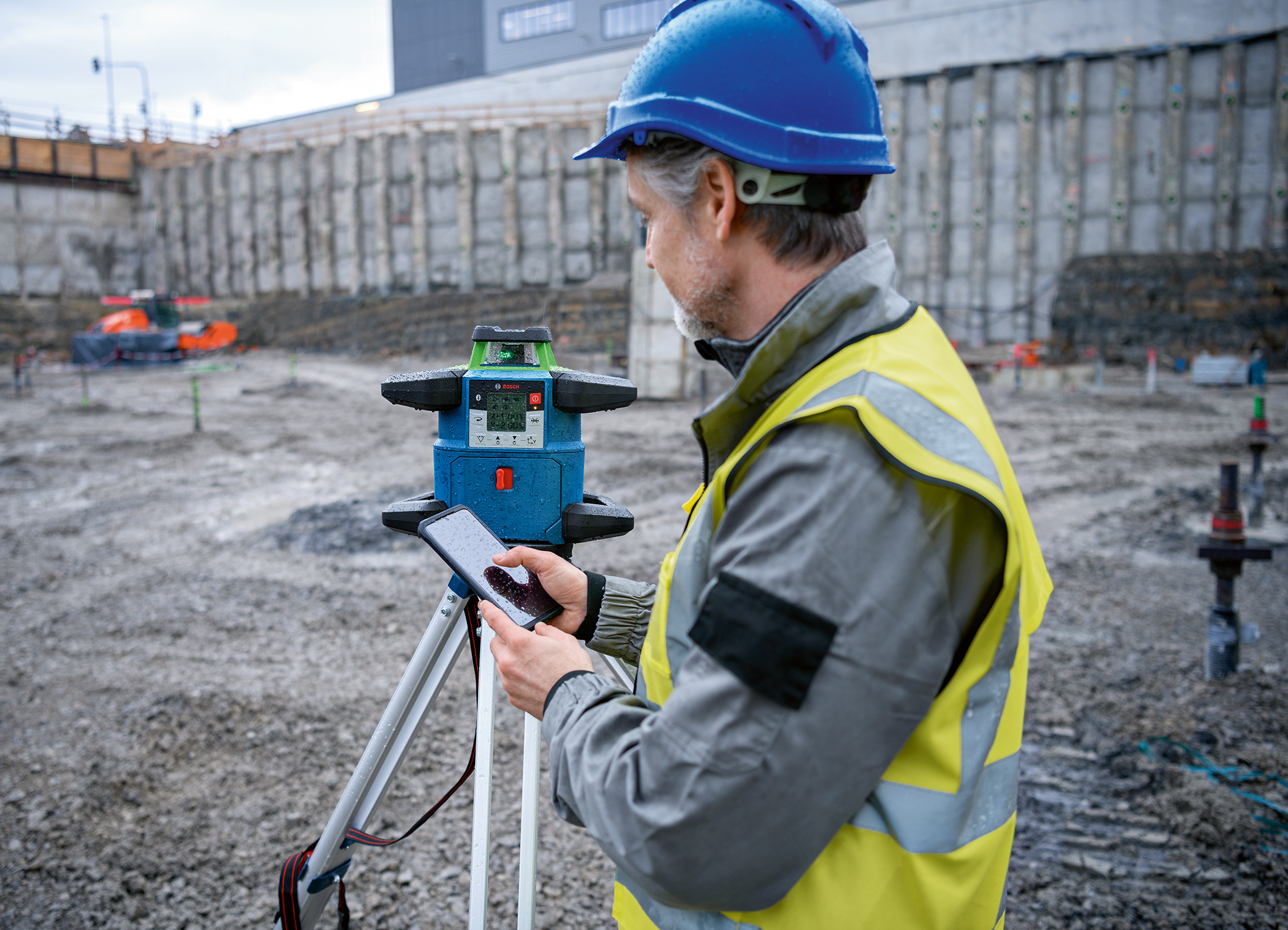 Ein besonders robuster und einfach bedienbarer Rotationslaser mit grünem Laser und hoher Reichweite ‒ das ist der neue GRL 650 CHVG Professional von Bosch. Er bietet Profis im Hoch- und Tiefbau, Straßen-, Fassaden-, Hallen- oder Landschaftsbau einen Arbeitsbereich von 650 Metern (Durchmesser) und ist besonders strapazierfähig: Der GRL 650 CHVG Professional ist mit IP 68 staub- und wasserdicht ‒ das schließt dank verschließbarem Batteriefach auch den Akku mit ein. Die seitlichen Griffe und sein umlaufendes Dämpfungsmaterial schützen den Rotationslaser zuverlässig vor Stößen, sodass er bei Nutzung mit Stativ zum Beispiel auch einen Sturz aus bis zu zwei Metern Höhe überstehen würde. Weiterer Vorteil ist die einfache Handhabung: Der Rotationslaser wird per Bluetooth mit dem Smartphone vernetzt und dann bequem über die Levelling Remote App gesteuert und personalisiert. Zusätzlich haben Profis beim GRL 650 CHVG Professional den Status über das integrierte Display stets im Blick. Gespeichert und direkt abrufbar sind hierüber jetzt zum Beispiel auch die letzten vier Neigungswerte der integrierten Doppel-Neigungsfunktion. Dadurch können Profis nach Arbeitsunterbrechungen eine bestimmte Anwendung ‒ wie das Ausrichten von Entwässerungen auf einen zentralen Abfluss hin ‒ schnell und einfach wieder aufnehmen. Der Rotationslaser bietet durch die neue CenterLock-Funktion darüber hinaus ein noch breiteres Anwendungsspektrum. Sie hilft zum Beispiel dabei, Fassaden präzise auszurichten.