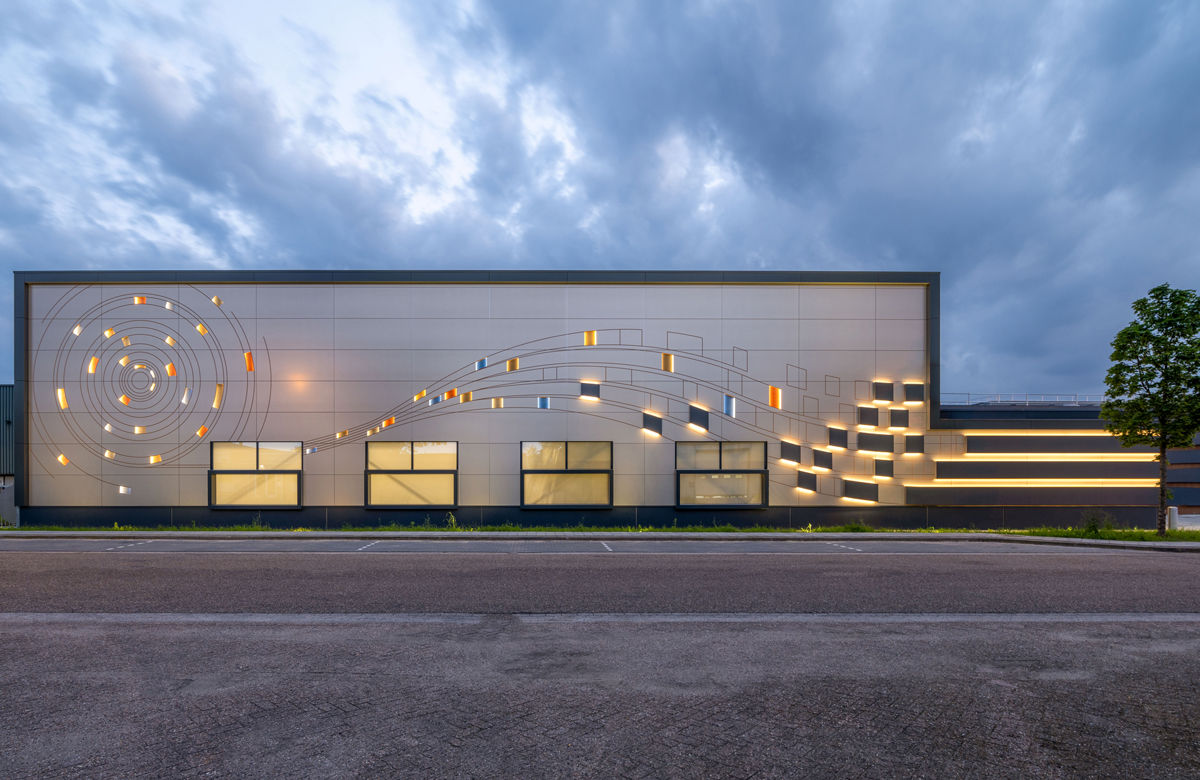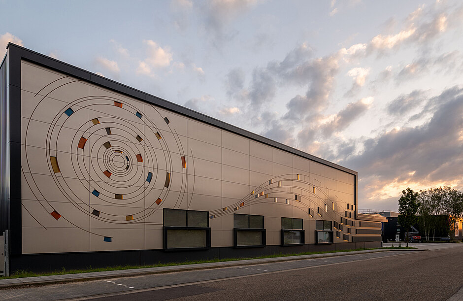 Der Entwurf für die neue Fassade stammt von Jelena Ivanisevic, Technical Support Manager bei Rockpanel und ausgebildete Architektin. »Das Design verbindet drei verschiedene Geschichten zu einer visuellen Erzählung, wobei die Nachhaltigkeit das zentrale Thema ist«, erläutert sie. »Auf der linken Seite symbolisieren große und kleine Kreise die Zirkularität, die Verwendung von recyceltem Material durch Rockpanel und deren unbegrenzte Wiederverwendbarkeit.« Gleichzeitig belege die Fassade die Vielseitigkeit von Rockpanel, denn sie zeigt Perforationen, Biegungen, 3D-Elemente, eine integrierte Beleuchtung und Gravuren, deren Farbigkeit sich unter dem Einfluss von Sonnenlicht und Regen wandeln wird, weil die Farbbeschichtung bewusst vom Rohmaterial abgetragen wurde.