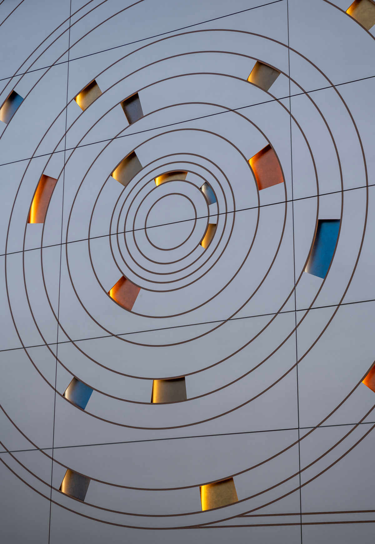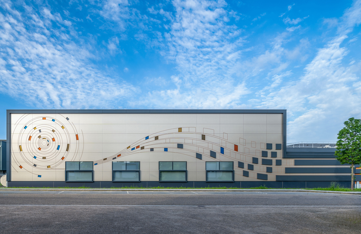 Der größte Teil der Fassade wurde mit Platten aus der Serie »Advanced Metals« im Design »Platinum« bekleidet. Über die Kreislinien in der Fassade »fliegen« Quadrate und Rechtecke in fünf Farben, die die Hauptbestandteile einer Rockpanel-Fassadenplatte symbolisieren: Basalt, recycelte Steinwolle, recycelte Materialien aus anderen Branchen, Bindemittel und Beschichtung. Eine Platte im Design »Stones Iron Grey« steht für den Basalt, das Design »Advanced Metals Electrum« für die recycelte Steinwolle. Das Design »Advanced Metals Dark Copper« symbolisiert die Entstehung des Plattenwerkstoffs aus hochverdichteter Steinwolle. Das natürliche Bindemittel, das in den Platten von Rockpanel verwendet wird, wird auf der Fassade durch »Advanced Metals Brass« dargestellt. »Advanced Metals Ultramarine« steht für die Beschichtung der Platten. Die fertigen Tafeln werden durch das Design »Metals Elemental Gunmetal« symbolisiert. Gerahmt wird die Erzählfassade von Rockpanel durch einen Streifen im Design »Colours« in der Farbe »RAL 7016«, wie er von Planern und Architekten häufig an Laibungen und der Attika eingesetzt wird.