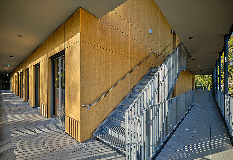 Im Attikabereich und an den Fronten der Betonbodenplatten im Bereich der umlaufenden Laubengänge wurden Tafeln der Serie »Colours« montiert. Sie strukturieren die Fassade mit ihrer vollflächig basaltgrauen, matten Farbigkeit. Insgesamt kamen an der Schule rund 1 500 m² Fassadentafeln von Rockpanel zum Einsatz.