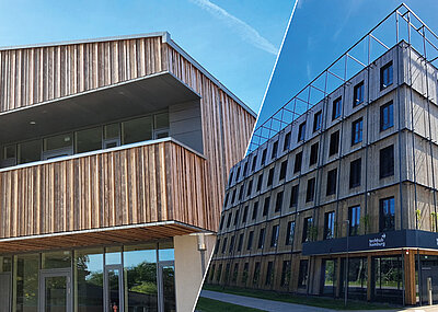 Die Fassadenbekleidung für den Schulbau sollte einerseits unterstreichen, dass er in Holzmodulbauweise entstanden ist, andererseits aber auch die gesetzlichen Anforderungen an den Brandschutz erfüllen. So entschied sich die Stadt Essen nicht nur für eine energetisch wirksame, nichtbrennbare Fassadendämmung aus Steinwolle von Rockwool, sondern auch für eine Bekleidung aus Steinwolle des Tochterunternehmens Rockpanel. Eingesetzt wurden Tafeln der Serie »Woods« im Design Buche. Sie wurden auf eine Aluminiumunterkonstruktion montiert.