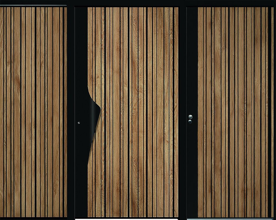 Der steigenden Nachfrage nach Haustürfüllungen der Kollektion »Art Decor-Paneele« tragen eine Reihe neu gestalteter Modelle Rechnung. Die exklusive Produktserie orientiert sich an der aus dem Interior-Bereich bekannten und angesagten Akustikpaneele. Allen Modellen gemeinsam sind pflegeleichte Dekoroberflächen in naturgetreuer Holzoptik mit manuell auslackierten Nuten in Tiefschwarz-Feinstruktur. Welches Gestaltungspotenzial der Werkstoff Glas mit sich bringt, zeigen die Haustürfüllungen der »Vitrum«-Kollektion mit Designoberflächen aus lackiertem Glas. »Vitrum« steht für neue, innovative Materialkombinationen. Das Sortiment beinhaltet Kunststoff- und Aluminiumfüllungen, veredelt durch eine äußere Deckschicht aus lackiertem Glas in Tiefschwarz oder Anthrazitgrau, wodurch brillante Farb- und Glanzeffekte erzielt werden.