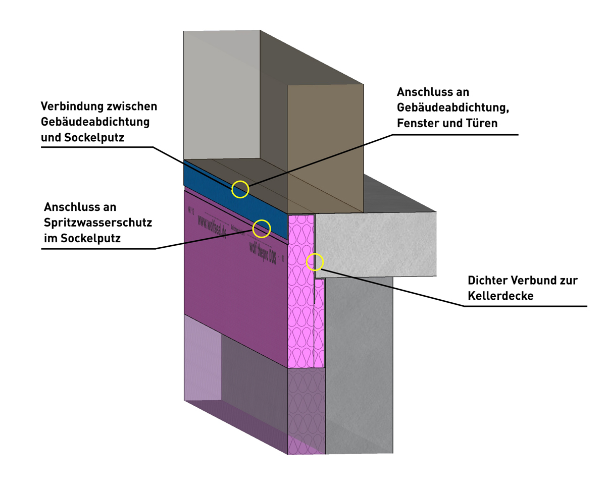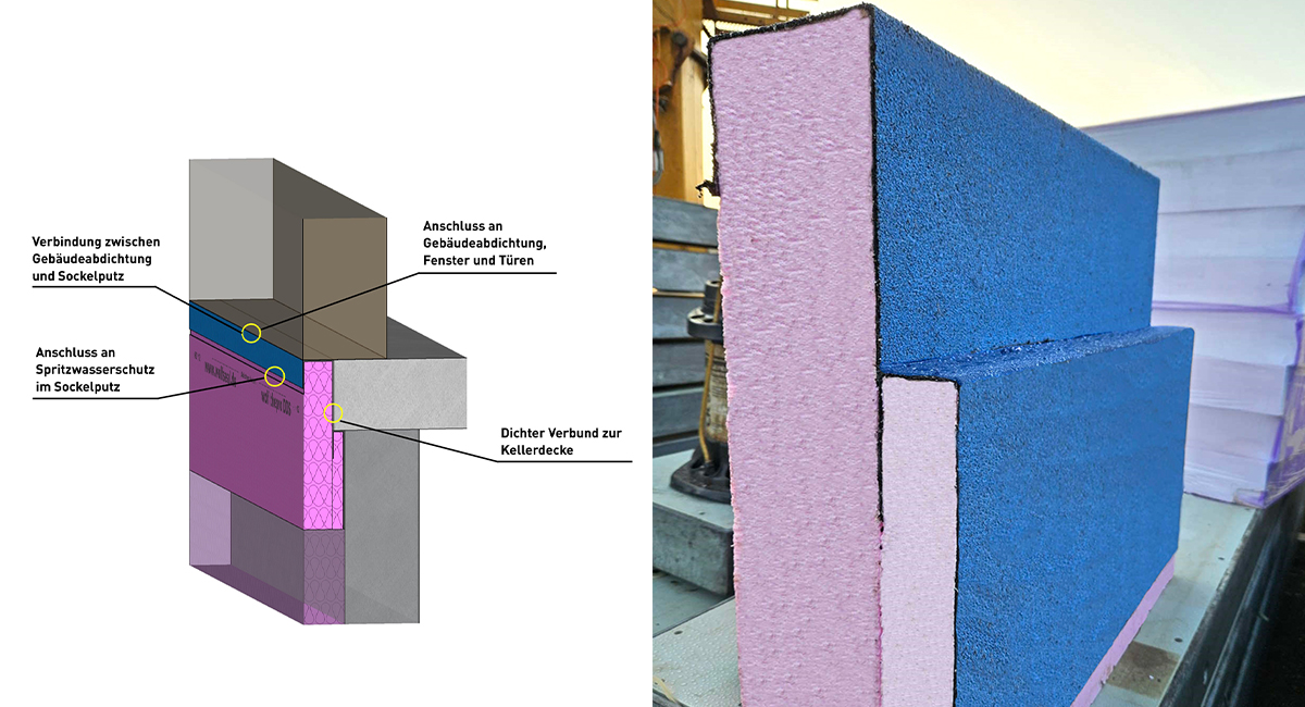 Bereits die Standardausführung des »thepro DDS«-Systems kombiniert werkseitig eine Frischbetonverbund-Dichtungsbahn mit XPS-Wärmedämmung und übernimmt zugleich die Funktion eines Schalbretts. Damit wird nicht nur eine hinterlaufsichere Sockelabdichtung und -dämmung geschaffen, sondern auch die Verarbeitung auf der Baustelle deutlich erleichtert. Die Anschlussflächen bleiben eben und frei zugänglich – eine Voraussetzung für eine normgerechte und dauerhaft sichere Abdichtung gemäß DIN 18533 (W4-E).