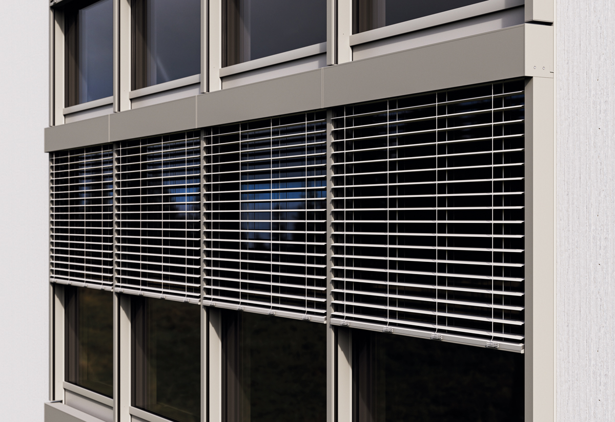 Dank der nur 50 mm breiten Führungsschienen fügt sich der Raffstore flächenbündig in die Fassade ein und sorgt für ein ruhiges, harmonisches Erscheinungsbild ohne sichtbare Befestigungselemente. Ein neu konzipierter, robuster Stahlzapfen verbindet Blende und Schiene zu einem selbsttragenden System. So entfallen zusätzliche Befestigungen an der Pfosten-Riegel-Fassade, Material und Montagezeit werden reduziert, und es entstehen neue Gestaltungsmöglichkeiten für durchgehende Reihenanlagen. Die patentierten Anbindungen ermöglichen eine besonders einfache und präzise Montage – auch bei großflächigen Fassadenprojekten.