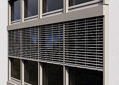 Dank der nur 50 mm breiten Führungsschienen fügt sich der Raffstore flächenbündig in die Fassade ein und sorgt für ein ruhiges, harmonisches Erscheinungsbild ohne sichtbare Befestigungselemente. Ein neu konzipierter, robuster Stahlzapfen verbindet Blende und Schiene zu einem selbsttragenden System. So entfallen zusätzliche Befestigungen an der Pfosten-Riegel-Fassade, Material und Montagezeit werden reduziert, und es entstehen neue Gestaltungsmöglichkeiten für durchgehende Reihenanlagen. Die patentierten Anbindungen ermöglichen eine besonders einfache und präzise Montage – auch bei großflächigen Fassadenprojekten.