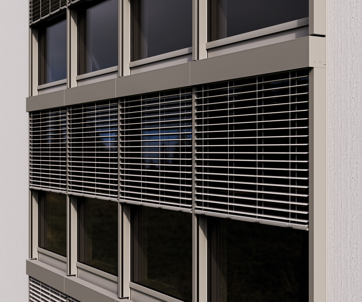 Die Produkte »Raffstore F50« und »zipScreen F50« sind technisch wie optisch perfekt aufeinander abgestimmt und ermöglichen eine durchgängige, designorientierte Fassadengestaltung – unabhängig davon, ob außenliegende Lichtlenkung oder textile Verschattung gewünscht ist. Das System überzeugt durch klare Formensprache, hohe Windstabilität und eine kompromisslose Integration in moderne Fassadenkonzepte.
