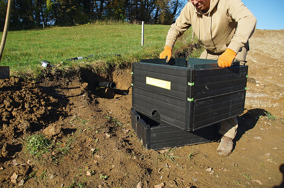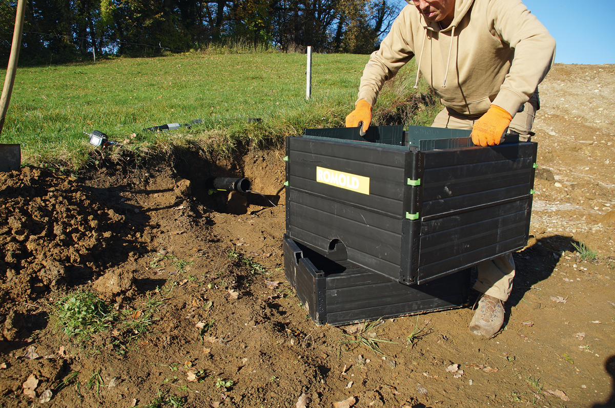 Die Produktneuheit besteht aus mehreren horizontalen Modulen, die sich leicht trennen lassen. In gewünschter Höhe werden mit einem Kronenbohrer die entsprechenden Öffnungen mit dem benötigten Durchmesser geschaffen. Die »Rom-Box Gala« besteht zu 100 Prozent aus recycelbarem Polypropylen und überzeugt laut Hersteller durch ihr geringes Gewicht sowie kompakte Abmessungen. Sie lässt sich von einer Person bequem versetzen und einbauen. Schweres Gerät wird nicht benötigt. Müssen bestehende Kabel oder Rohrleitungen überbaut werden, wird die Box einfach horizontal getrennt. Zunächst wird das unterste Element so versetzt, dass sich Kabel, Rohre und andere Installationselemente einfach und bequem in die zuvor erstellten Aussparungen einlegen lassen. Sind alle Leitungen platziert, werden die oberen Schachtelemente wieder aufgesetzt und die Halteclips eingesetzt. Die Oberkante des Schachts befindet sich nun knapp über Bodenniveau. Zum Schluss wird noch der extrem leichte Deckel aus Kompositmaterial in den Abdeckungsrahmen eingelegt und arretiert. Mit zusätzlichen speziellen Haltewinkeln lässt sich der Rahmen gegen unbefugtes Abheben sichern.