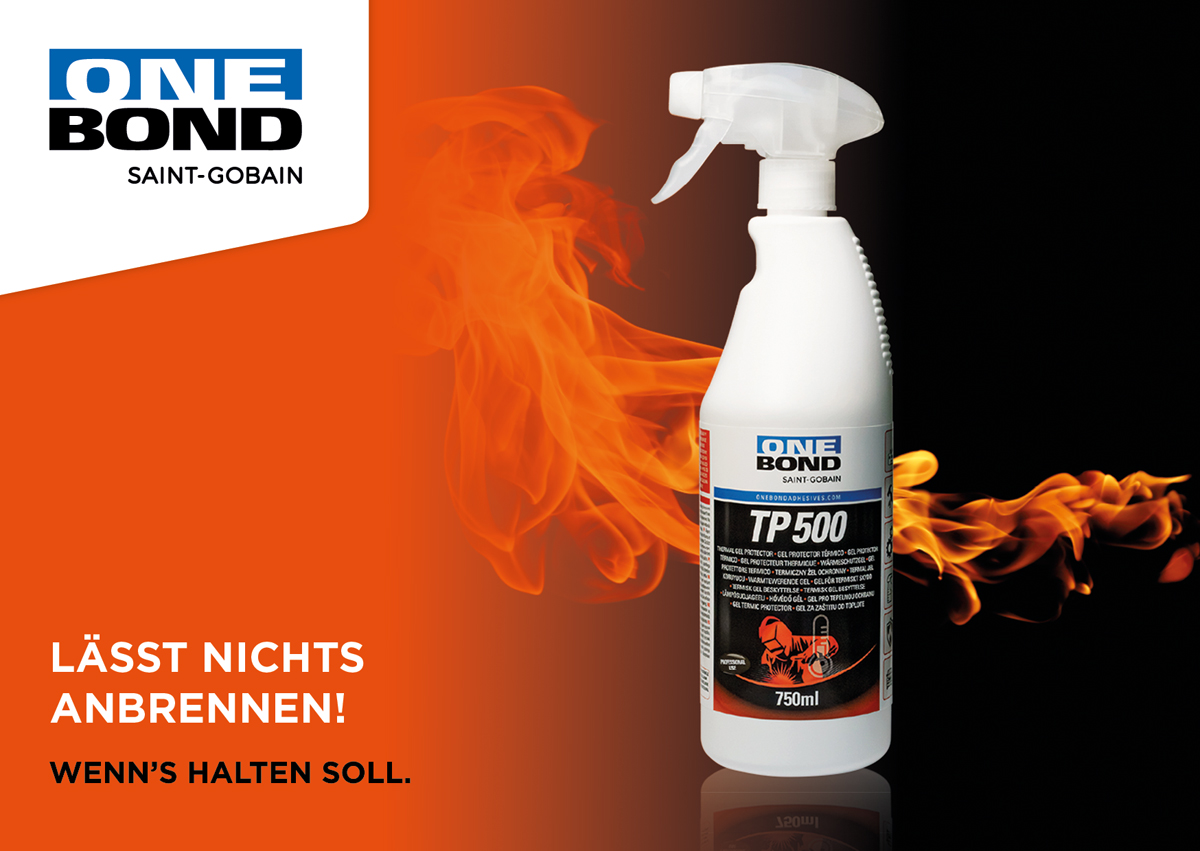 »OneBond TP500« wurde speziell für den Hitzeschutz von Oberflächen in der Nähe von Schweiß- oder Schleifbereichen entwickelt. Das transparente Mittel ist geeignet für die unterschiedlichsten Anforderungen in Bereichen wie etwa Heizung, Sanitär- oder Klimaanlagen. »OneBond TP500« leitet die Hitze zuverlässig ab und absorbiert sie durch Verdampfen. Hitzeempfindliche Materialien wie Holz, Fliesen, Aluminium, Glas, Kunststoffe, Gummi oder Sitzdichtungen sind damit laut Hersteller vor Verbrennungen und Verformungen zuverlässig geschützt. »OneBond TP500« wird einfach aufgesprüht und haftet dank seiner speziellen Molekularstruktur als gelartige Masse sicher auch an vertikalen Oberflächen.