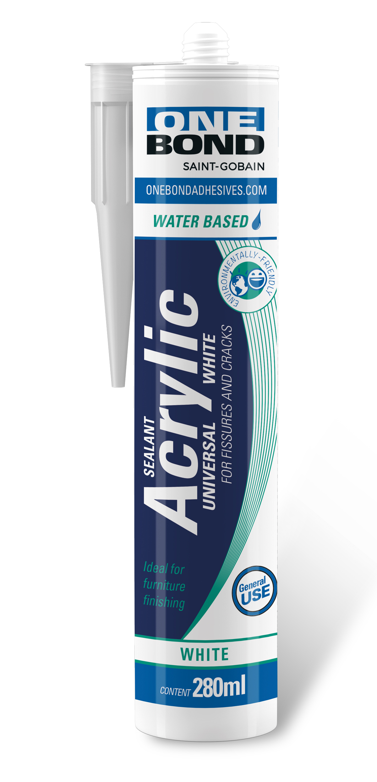 »OneBond Universal Arcyl« ist ein ungiftiger, einkomponentiger und weißer Dichtstoff auf Acrylbasis, mit dem sich Risse, die bei der Montage von Tischlerarbeiten entstehen, sowie Fugen etwa bei Treppen oder Holzdielen mühelos abdichten lassen. Ausgenommen sind Fugen, die ständiger Wassereinwirkung ausgesetzt oder vollständig geschlossen sind. Die Klebfreizeit des schleif- und streichbaren sowie hitzebeständigen Dichtstoffs variiert zwischen 25 und 60 Minuten, nach 24 Stunden kann die Abdichtung bereits überlackiert werden. »OneBond Universal Arcyl« haftet ohne Grundierung auf porösen Materialien wie Beton, Ziegel oder Holz und bleibt nach dem Aushärten über eine lange Zeit flexibel.